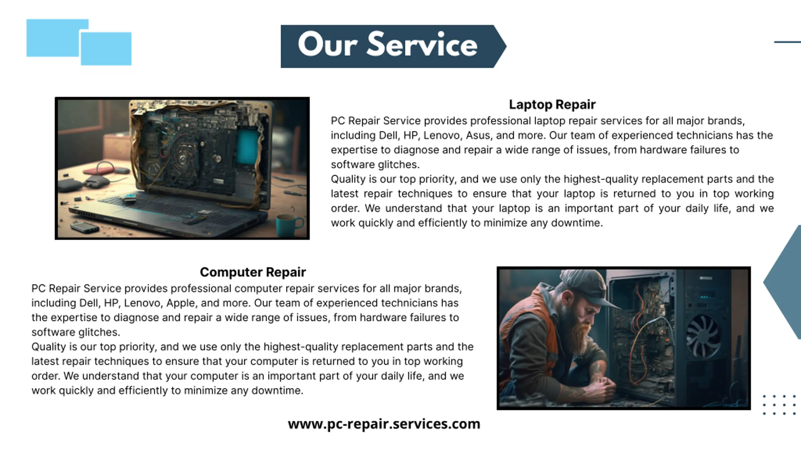 Our Service Our Service Laptop Repair PC Repair Service provides professional laptop repair services for all major brands, including Dell, HP, Lenovo, Asus, and more. Our team of experienced technicians has the expertise to diagnose and repair a wide range of issues, from hardware failures to software glitches. Quality is our top priority, and we use only the highest-quality replacement parts and the latest repair techniques to ensure that your laptop is returned to you in top working order. We understand that your laptop is an important part of your daily life, and we work quickly and efficiently to minimize any downtime. Computer Repair PC Repair Service provides professional computer repair services for all major brands, including Dell, HP, Lenovo, Apple, and more. Our team of experienced technicians has the expertise to diagnose and repair a wide range of issues, from hardware failures to software glitches. Quality is our top priority, and we use only the highest-quality replacement parts and the latest repair techniques to ensure that your computer is returned to you in top working order. We understand that your computer is an important part of your daily life, and we work quickly and efficiently to minimize any downtime. www.pc-repair.services.com