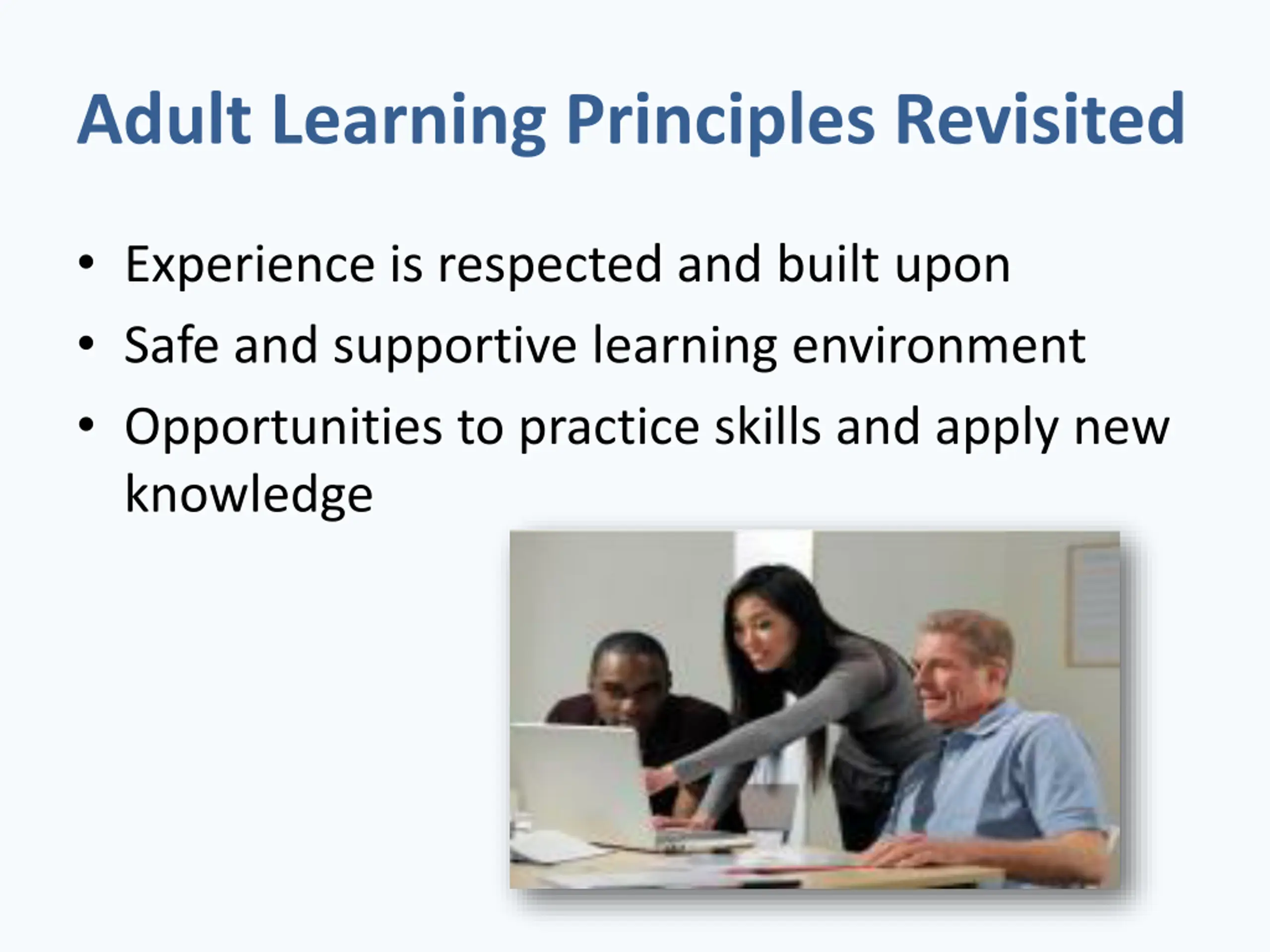 Adult Learning Principles Revisited Experience is respected and built upon Safe and supportive learning environment Opportunities to practice skills and apply new knowledge