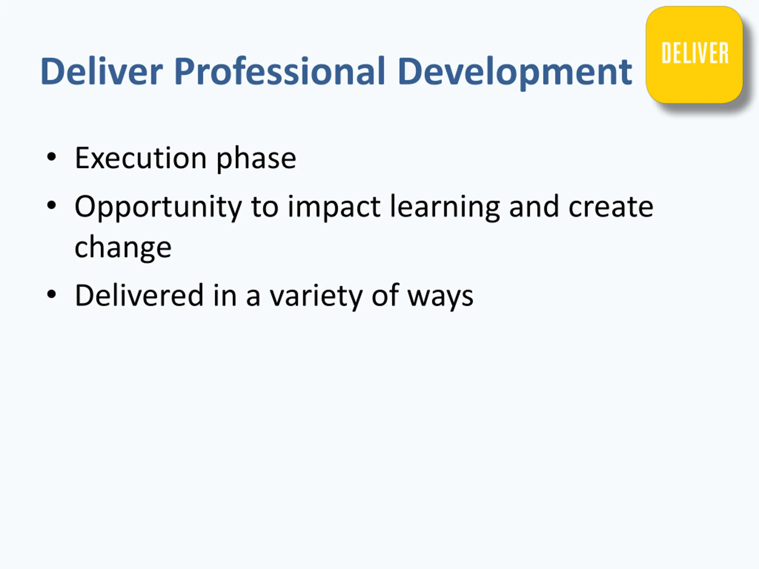 Deliver Professional Development Execution phase Opportunity to impact learning and create change Delivered in a variety of ways