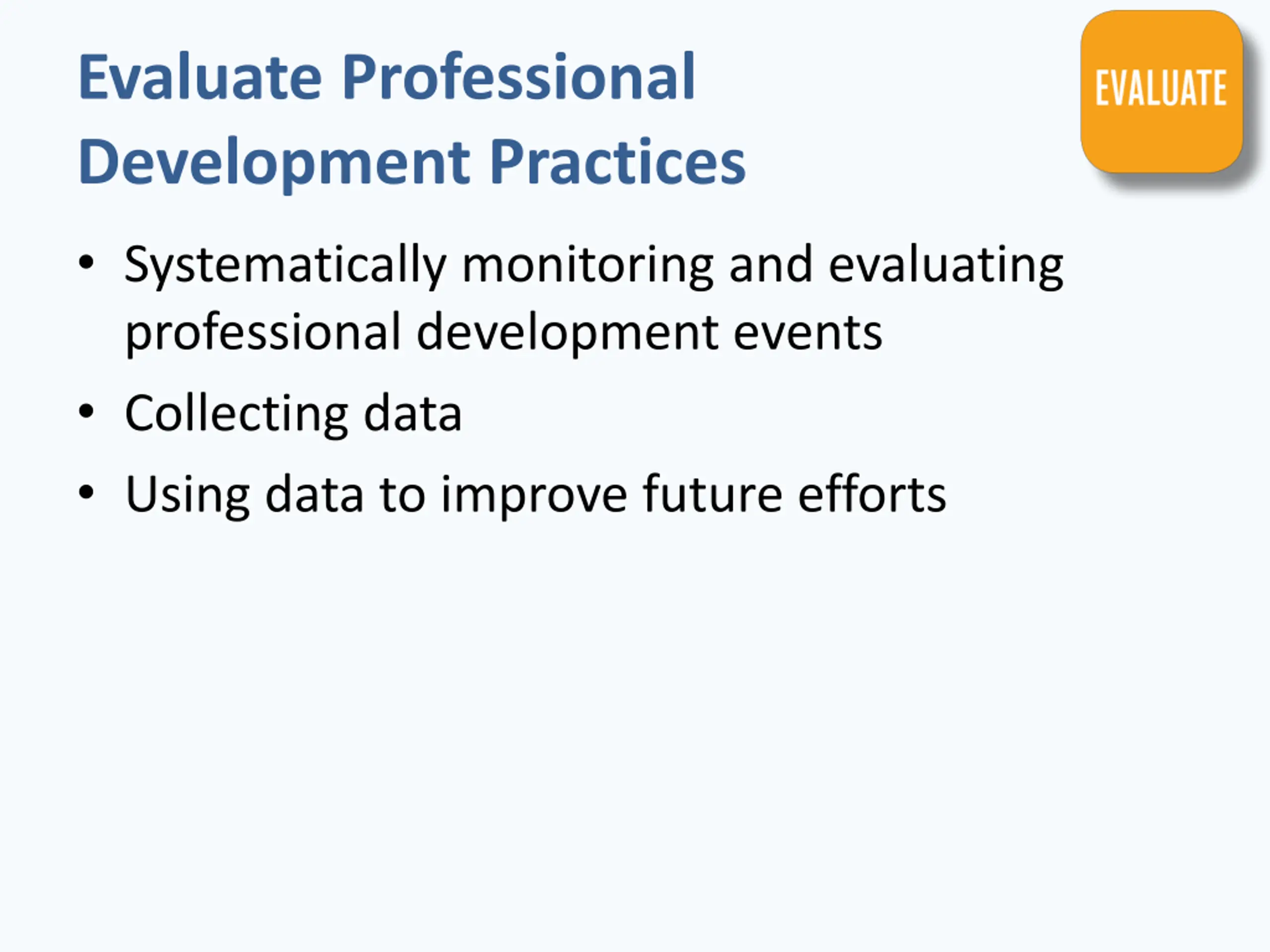 Evaluate Professional Development Practices Systematically monitoring and evaluating professional development events Collecting data Using data to improve future efforts