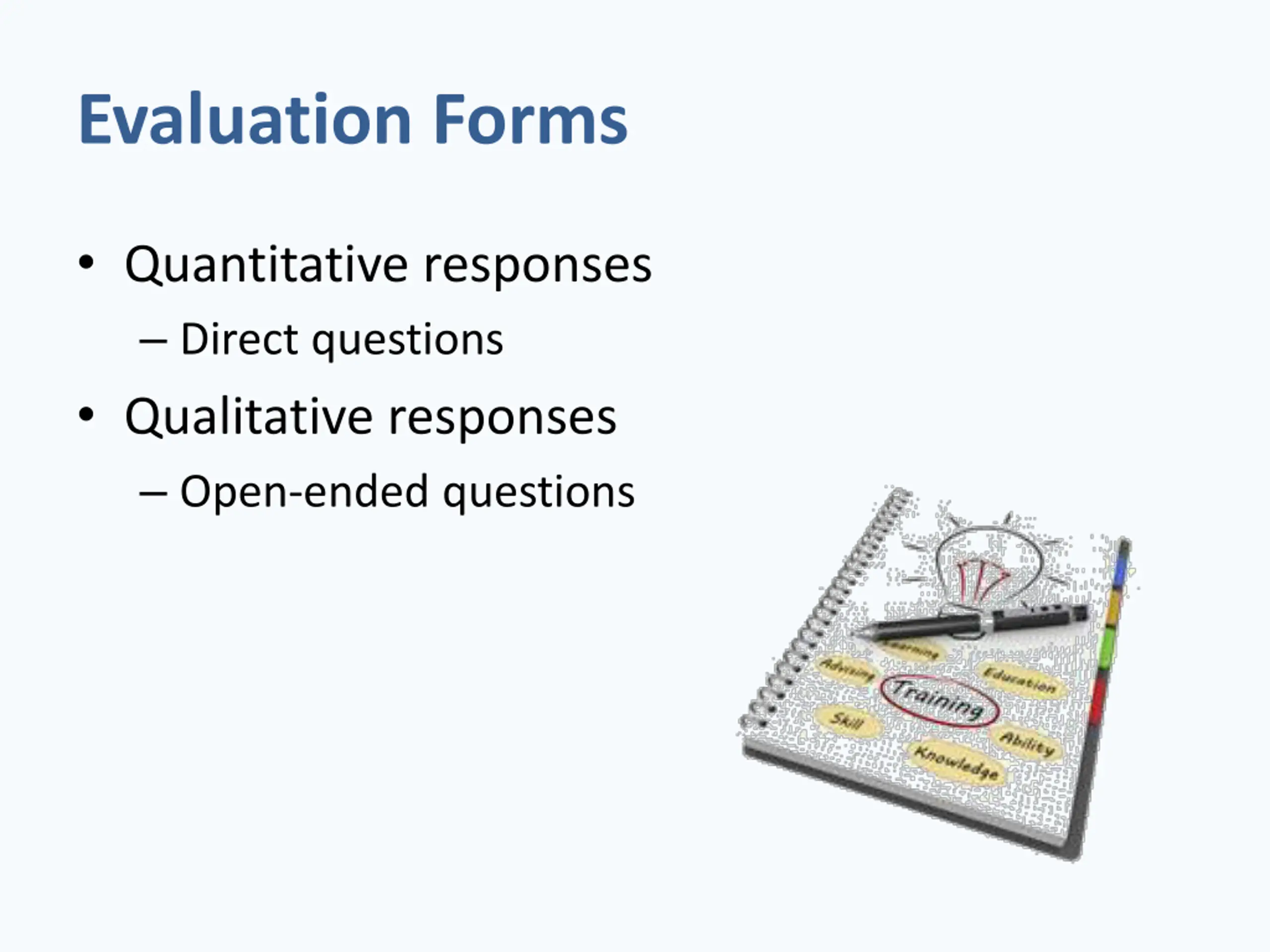 Evaluation Forms Quantitative responses Direct questions Qualitative responses Open-ended questions