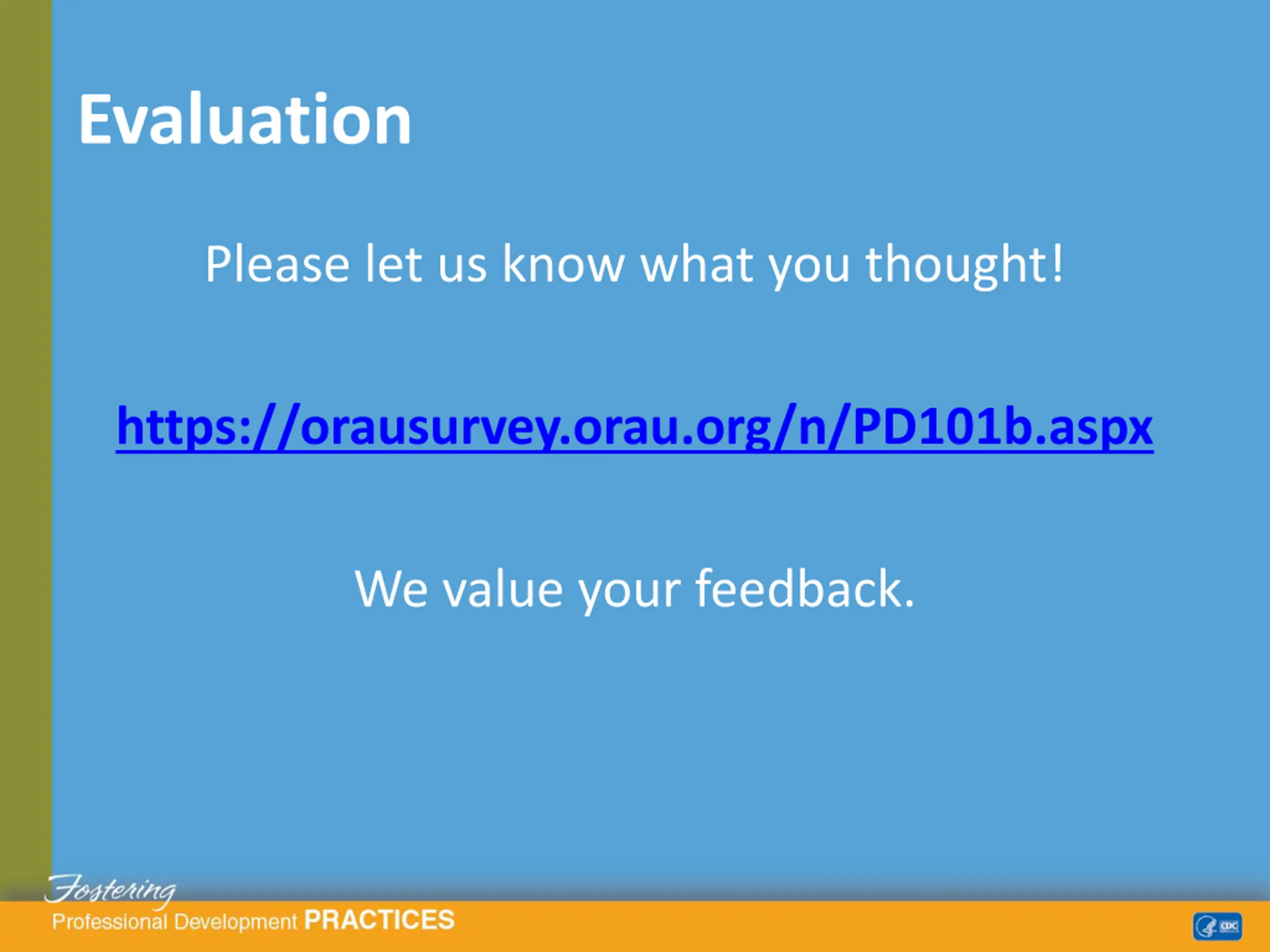 Evaluation Please let us know what you thought! https://orausurvey.orau.org/n/PD101b.aspx We value your feedback.