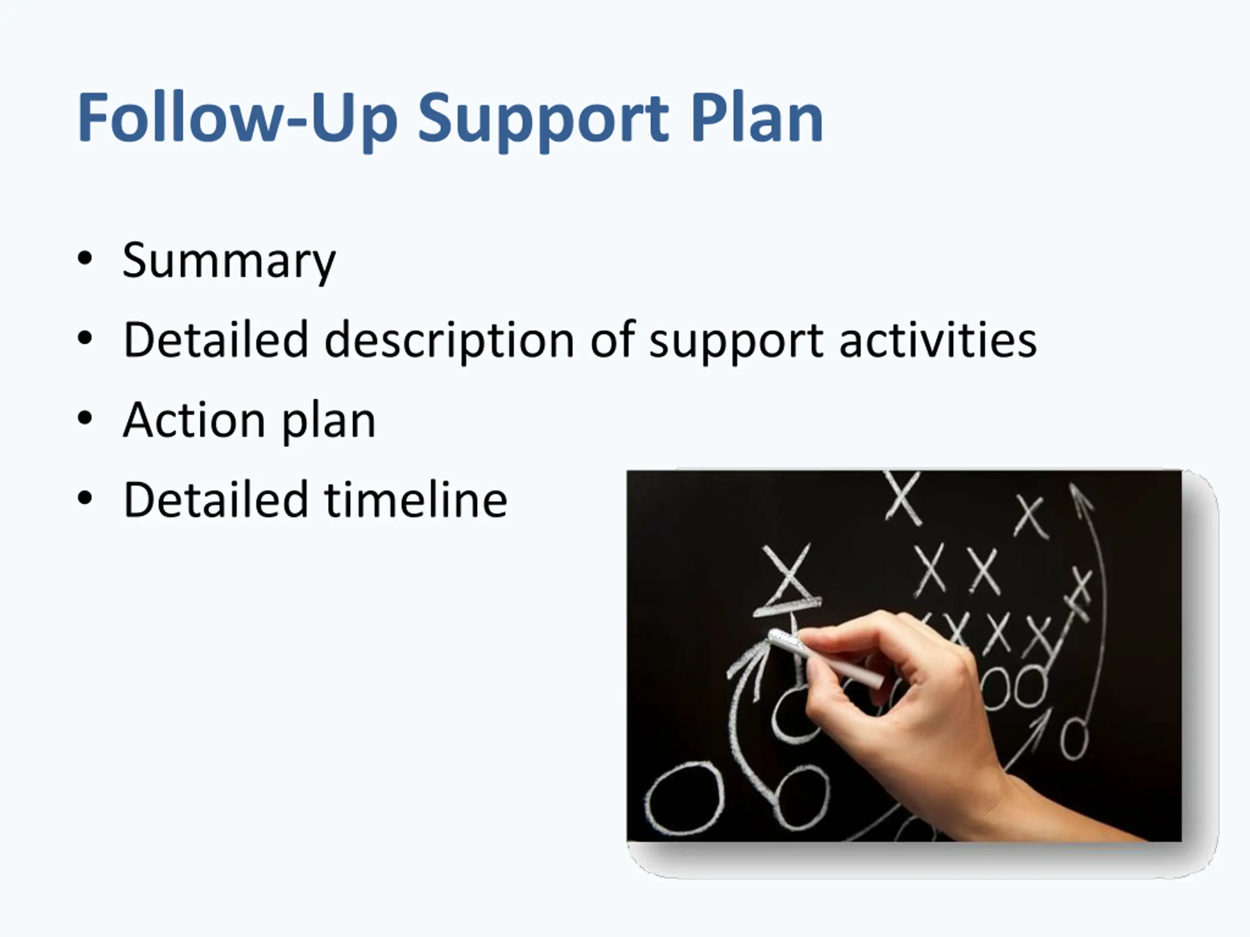 Follow-Up Support Plan Summary Detailed description of support activities Action plan Detailed timeline