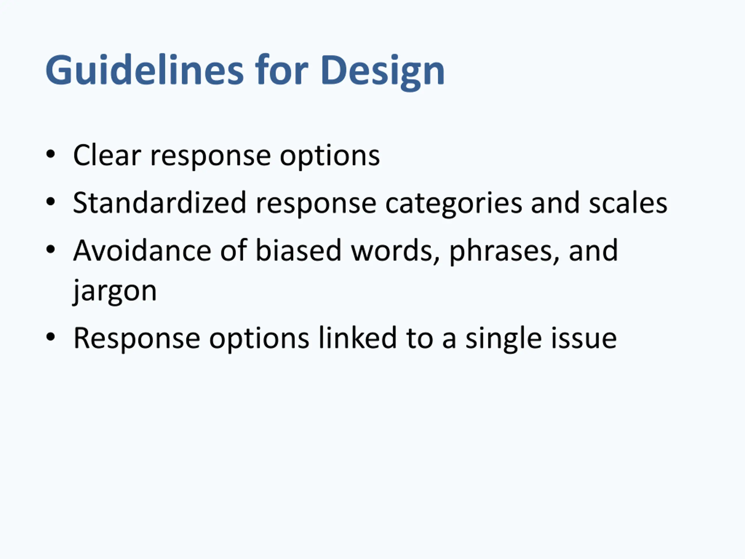 Guidelines for Design Clear response options Standardized response categories and scales Avoidance of biased words, phrases, and jargon Response options linked to a single issue