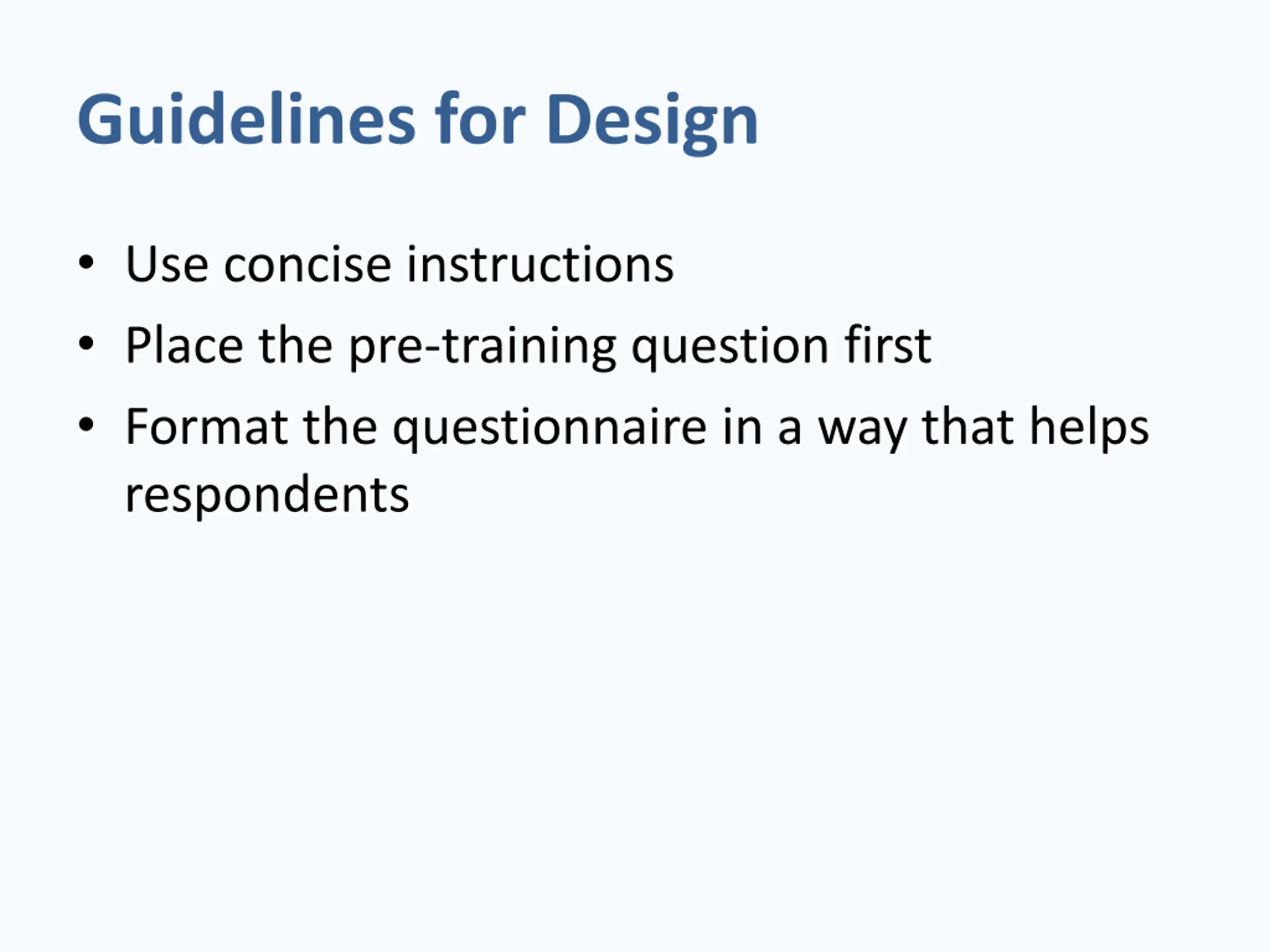 Guidelines for Design Use concise instructions Place the pre-training question first Format the questionnaire in a way that helps respondents