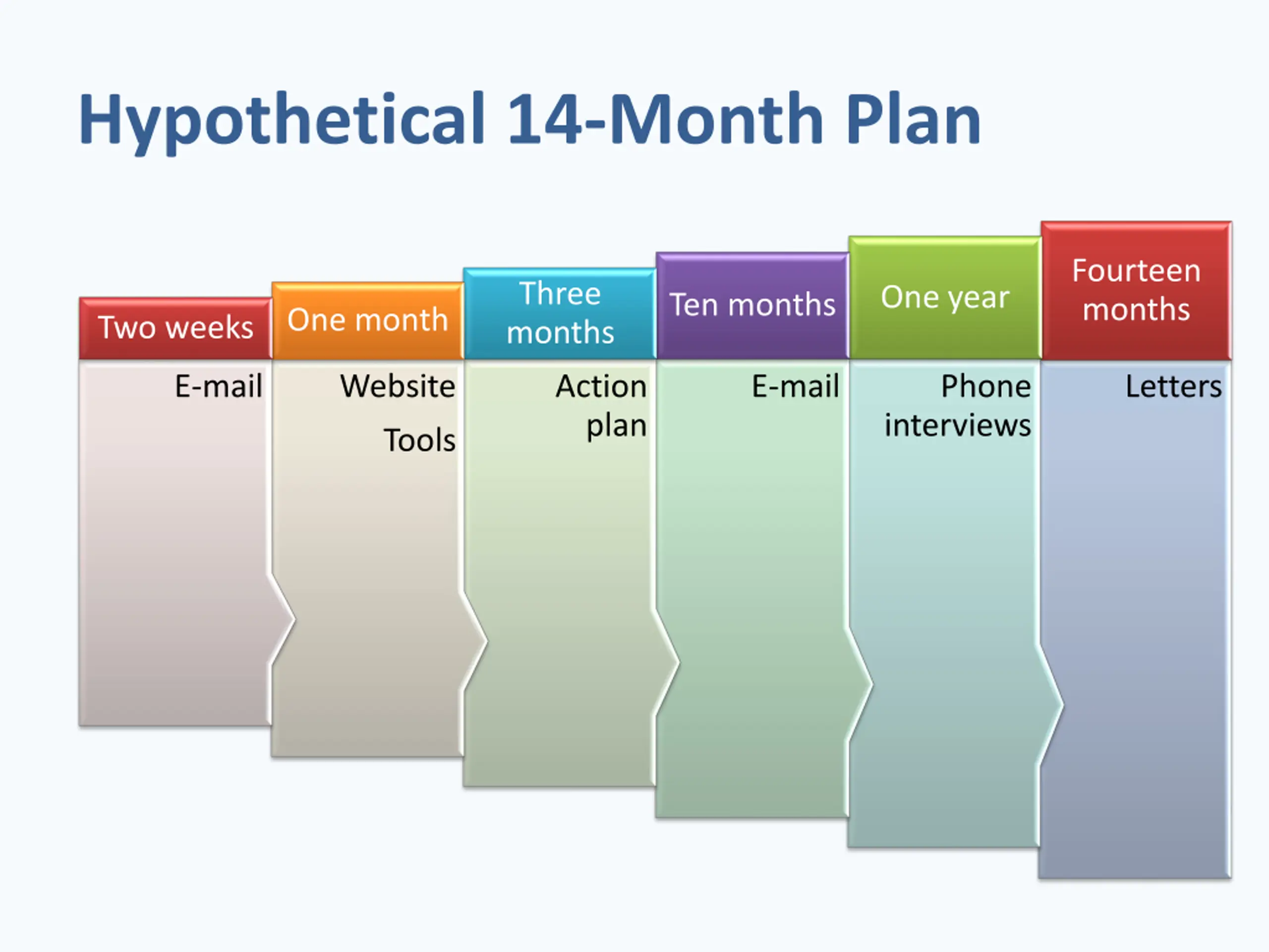 Hypothetical 14-Month Plan Fourteen months Three months One year Ten months One month Two weeks E-mail Website Action plan E-mail Phone Letters interviews Tools
