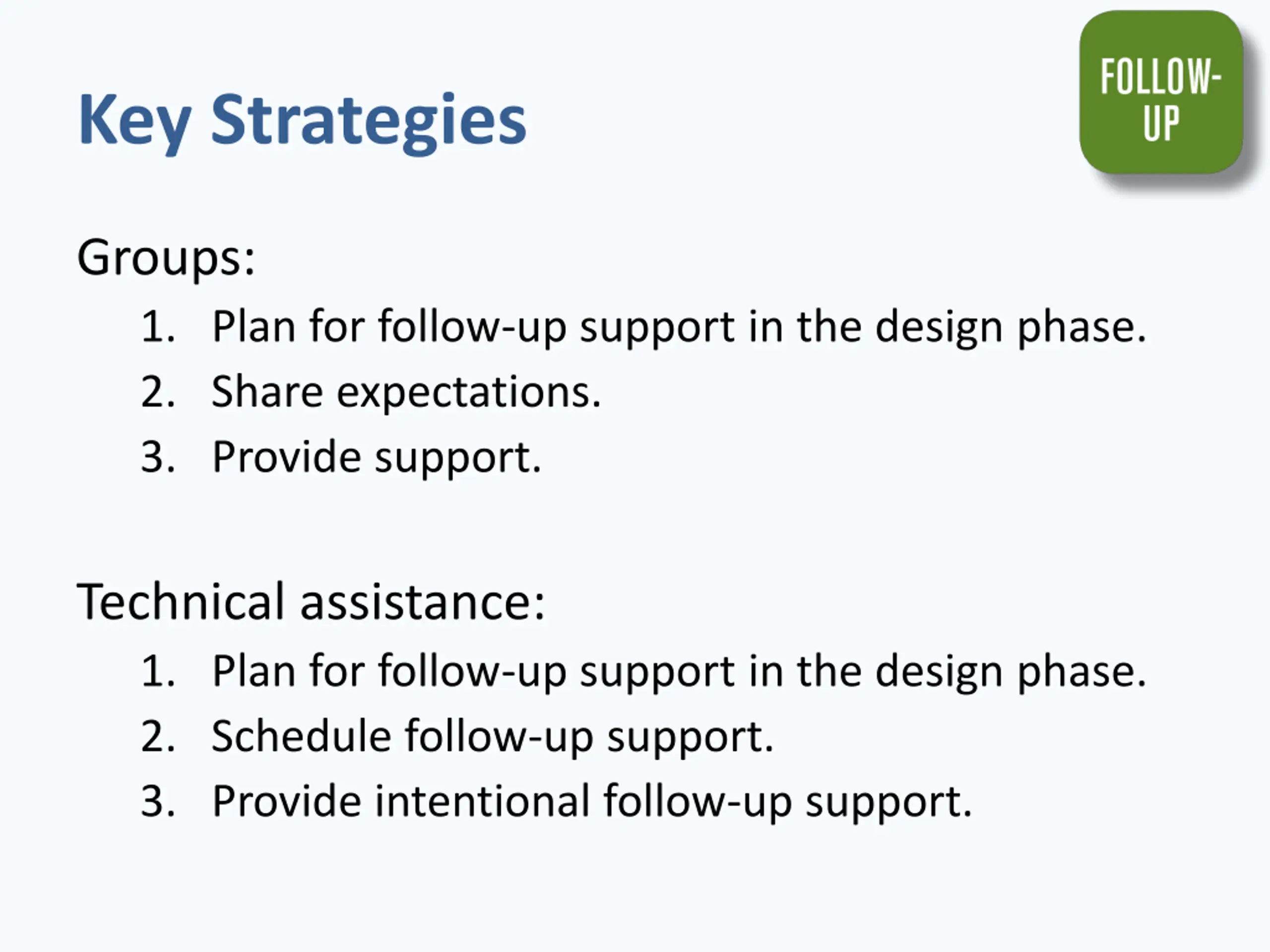 Key Strategies Groups: 1. Plan for follow-up support in the design phase. 2. Share expectations. 3. Provide support. Technical assistance: 1. Plan for follow-up support in the design phase. 2. Schedule follow-up support. 3. Provide intentional follow-up support.