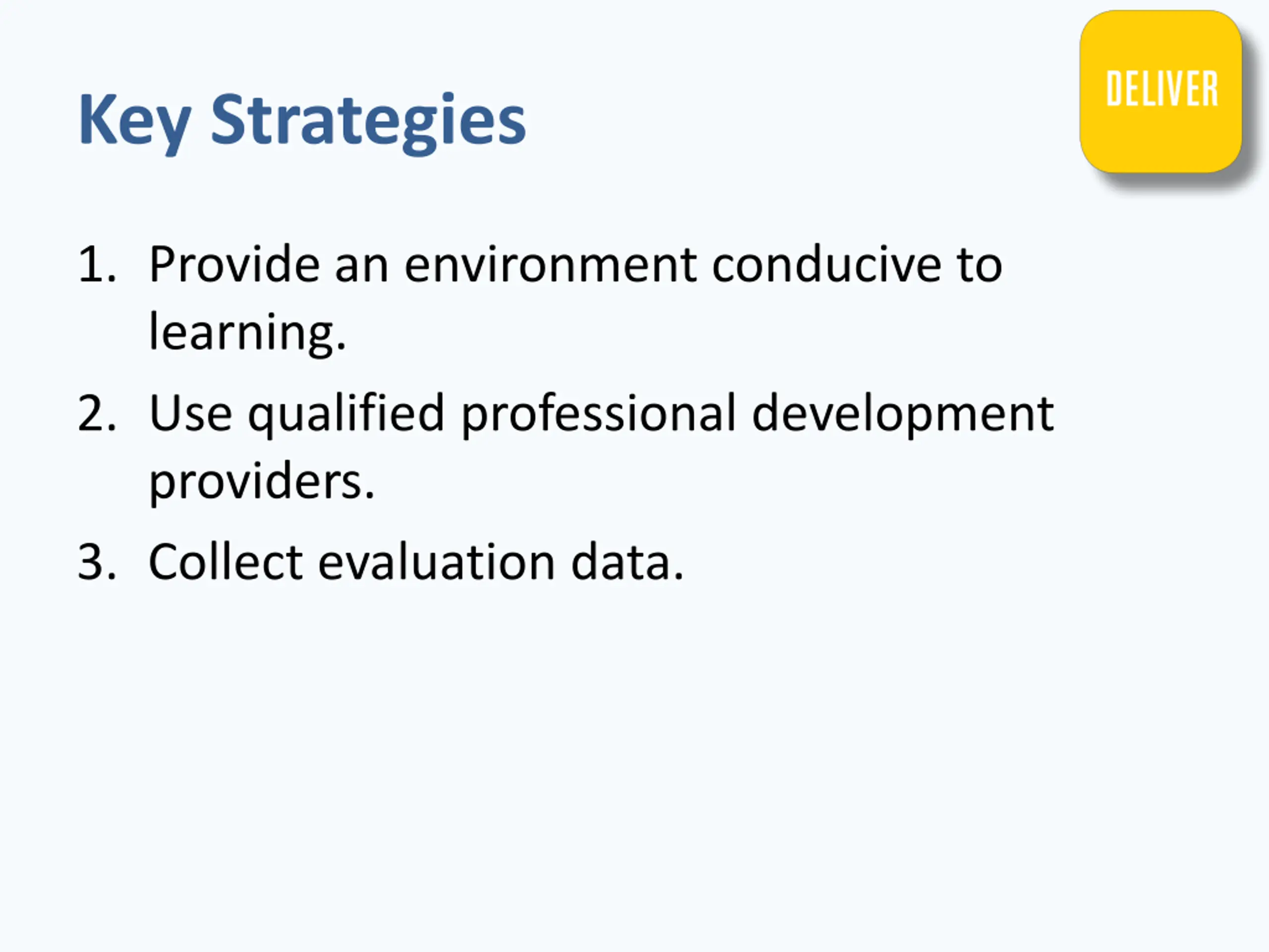 Key Strategies 1. Provide an environment conducive to learning. 2. Use qualified professional development providers. 3. Collect evaluation data.