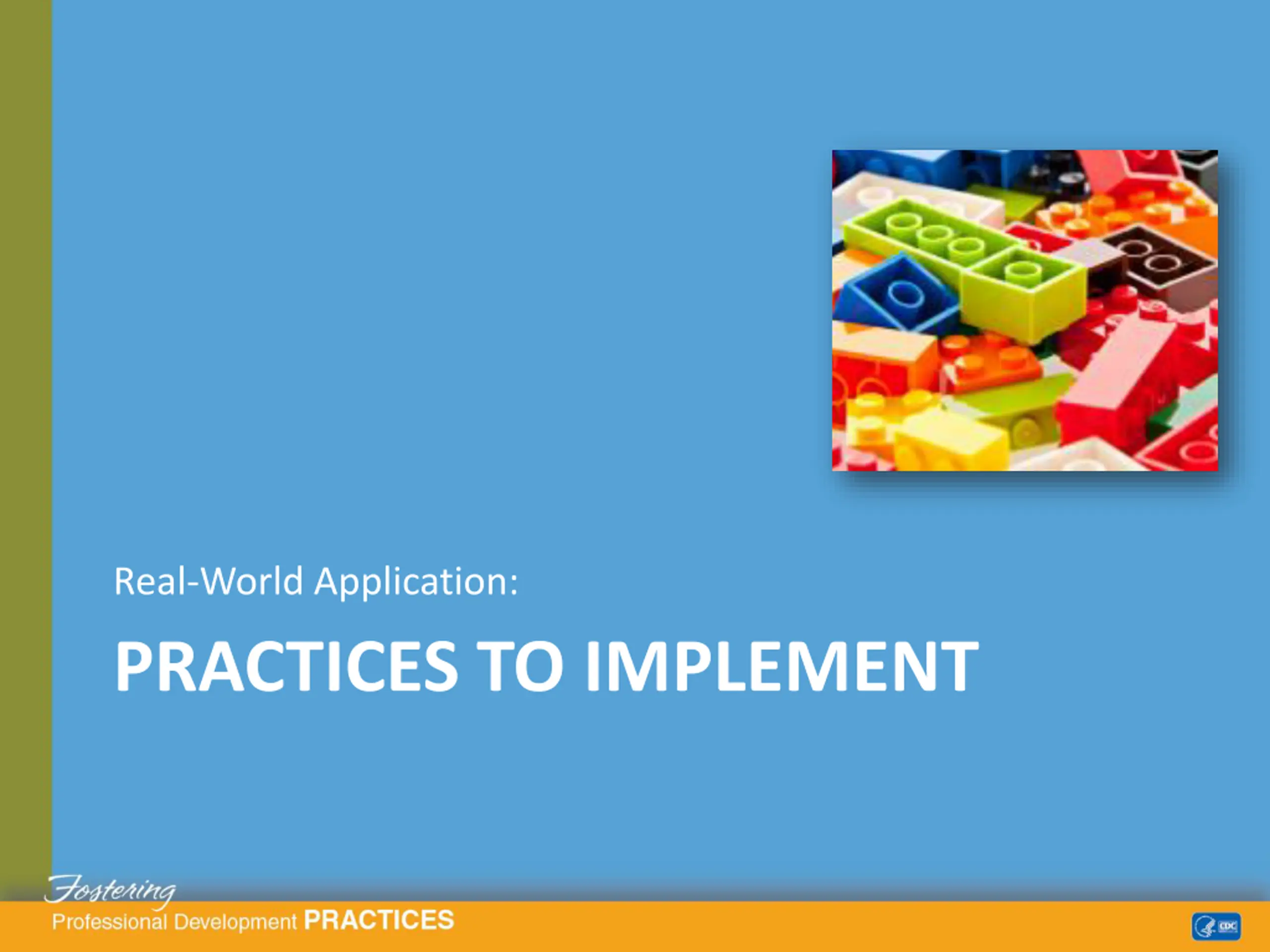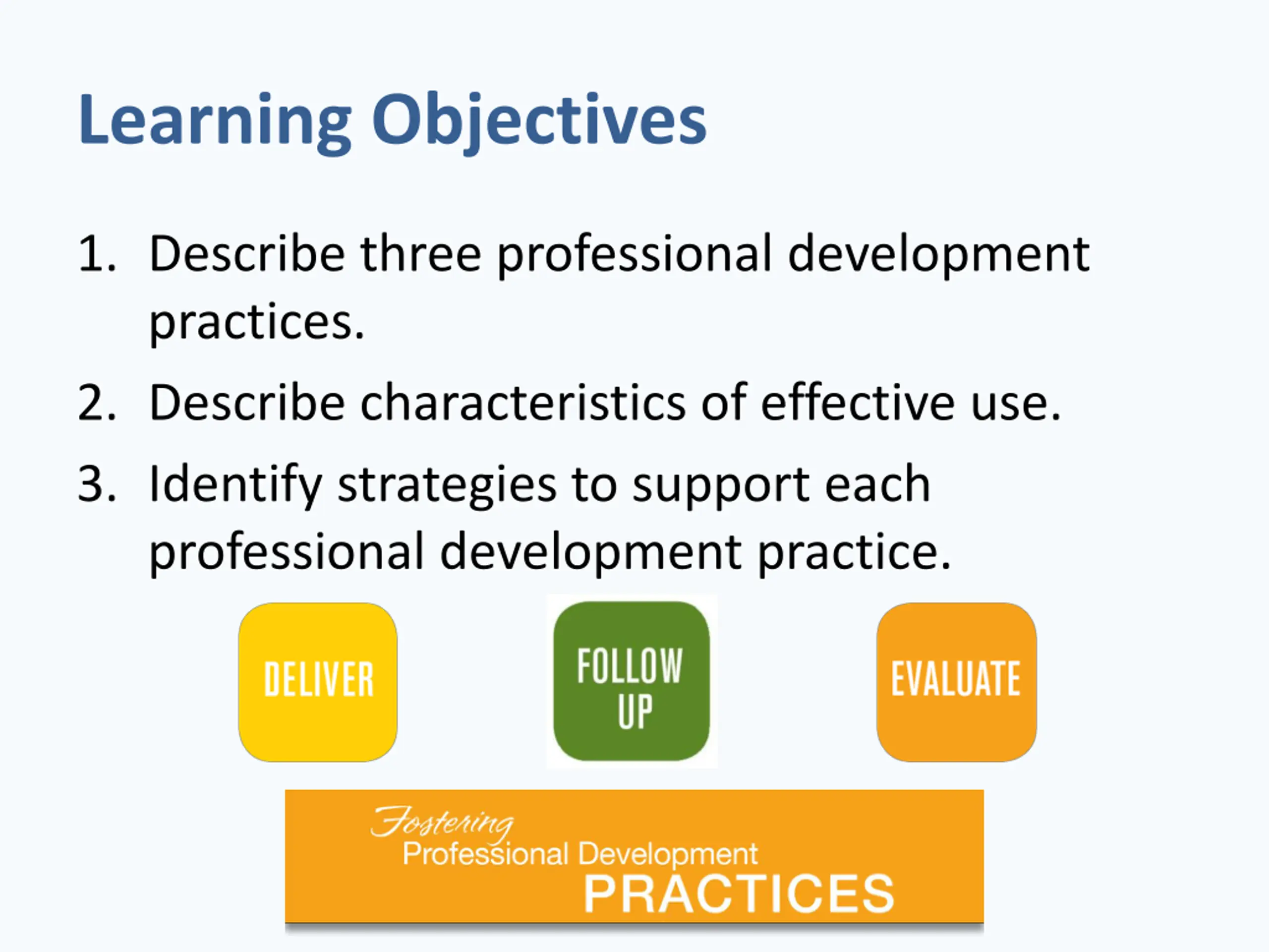 Learning Objectives 1. Describe three professional development practices. 2. Describe characteristics of effective use. 3. Identify strategies to support each professional development practice.