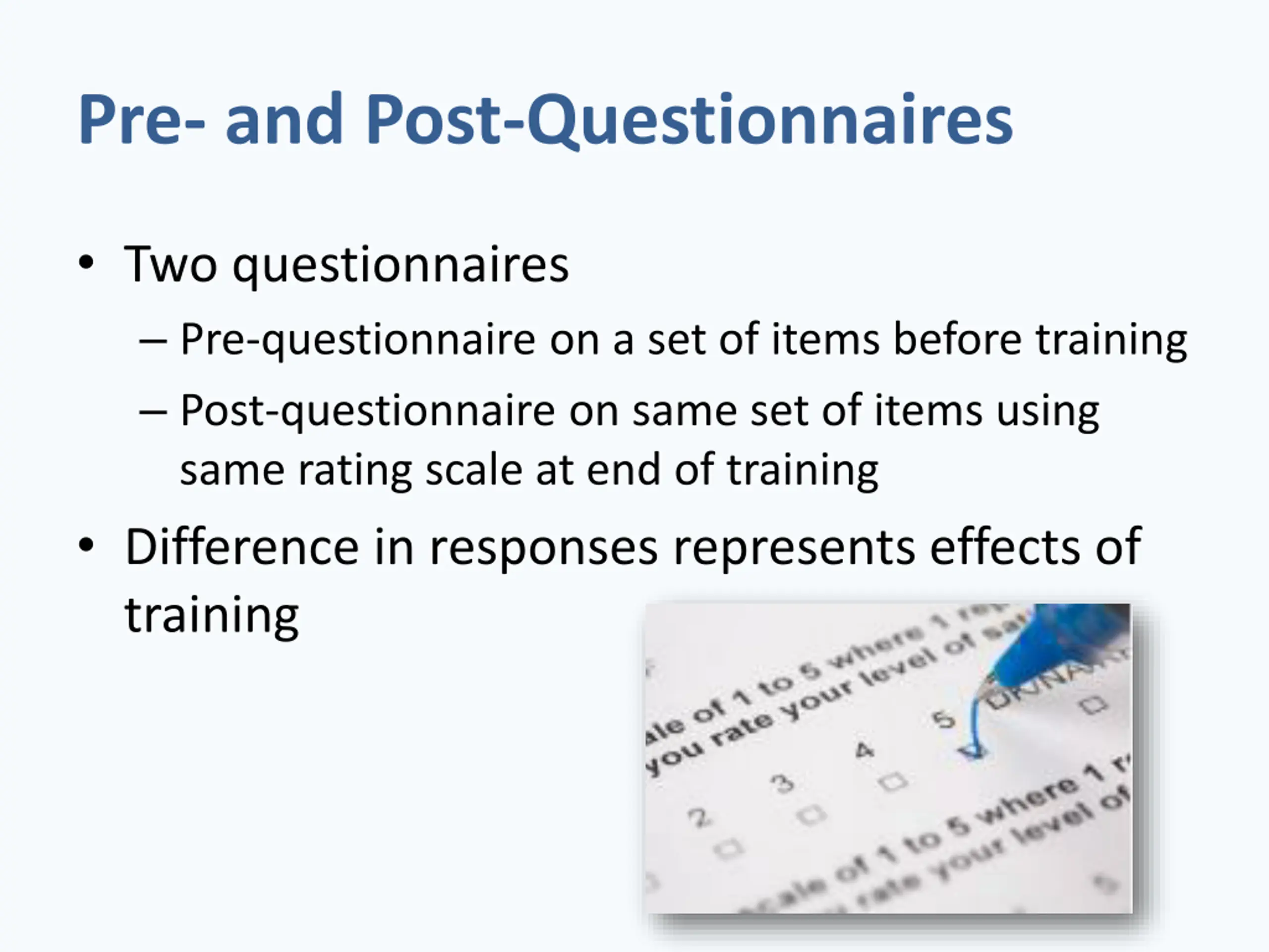 Pre- and Post-Questionnaires Two questionnaires Pre-questionnaire on a set of items before training Post-questionnaire on same set of items using same rating scale at end of training Difference in responses represents effects of training