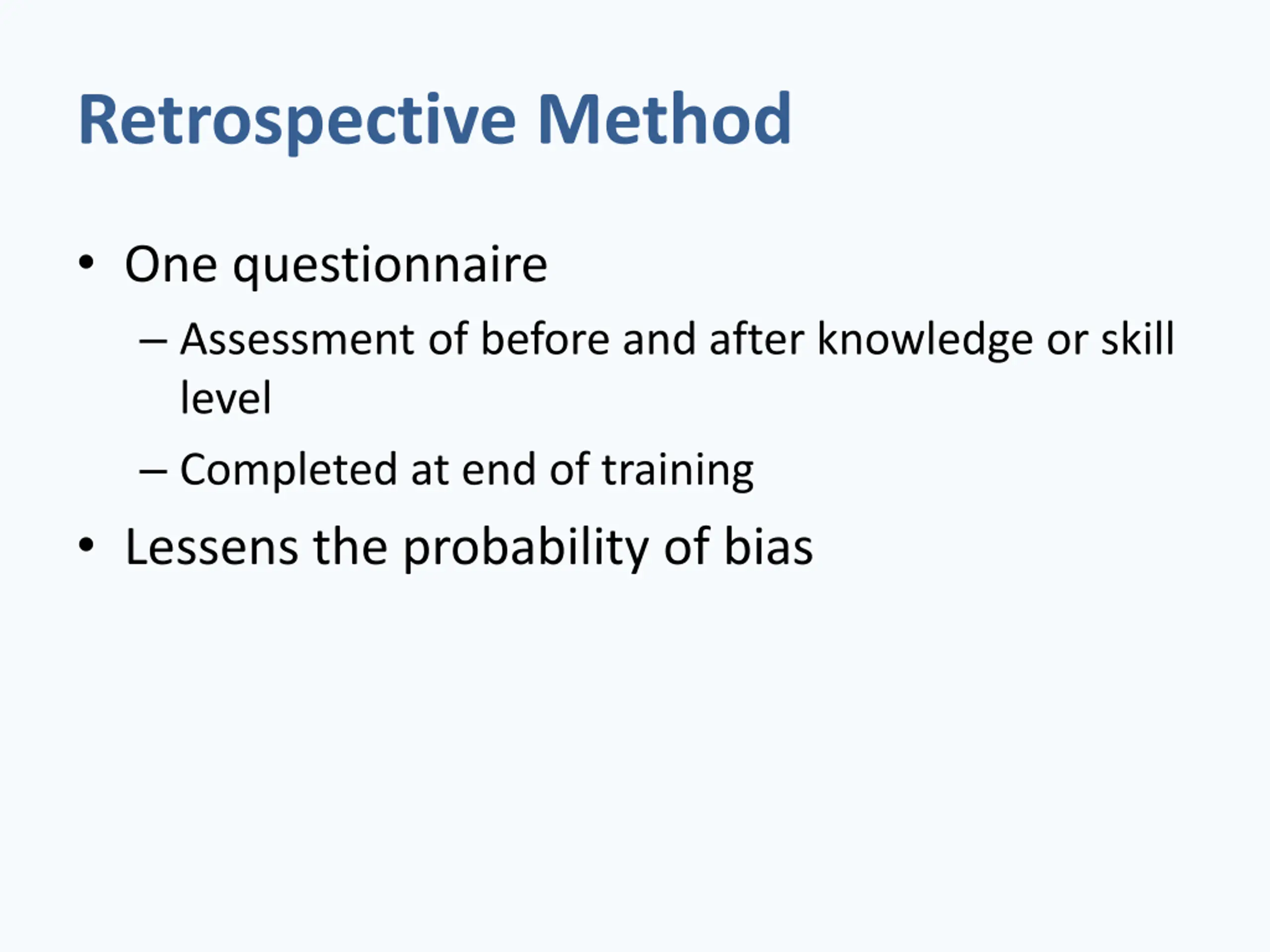 Retrospective Method One questionnaire Assessment of before and after knowledge or skill level Completed at end of training Lessens the probability of bias