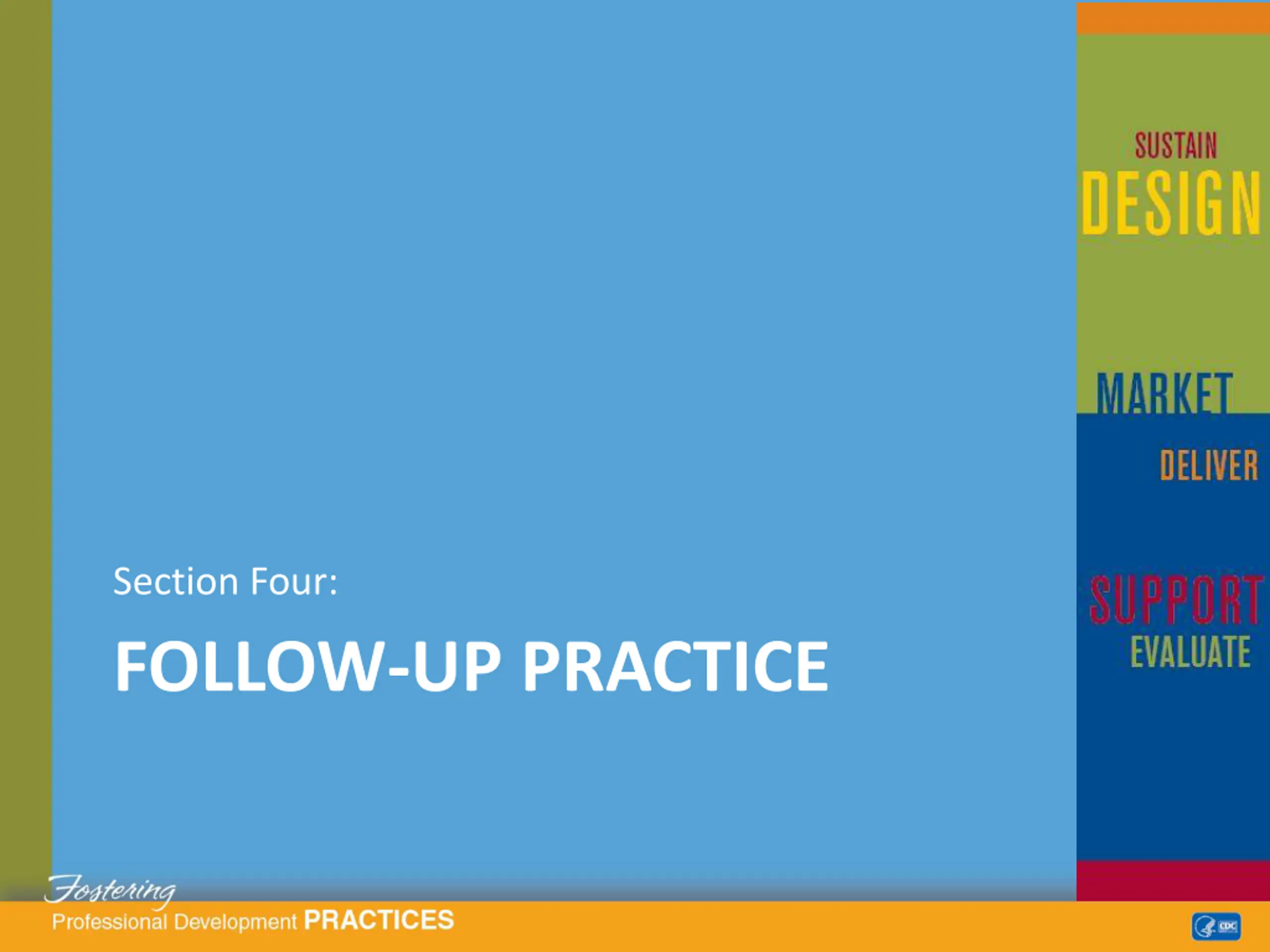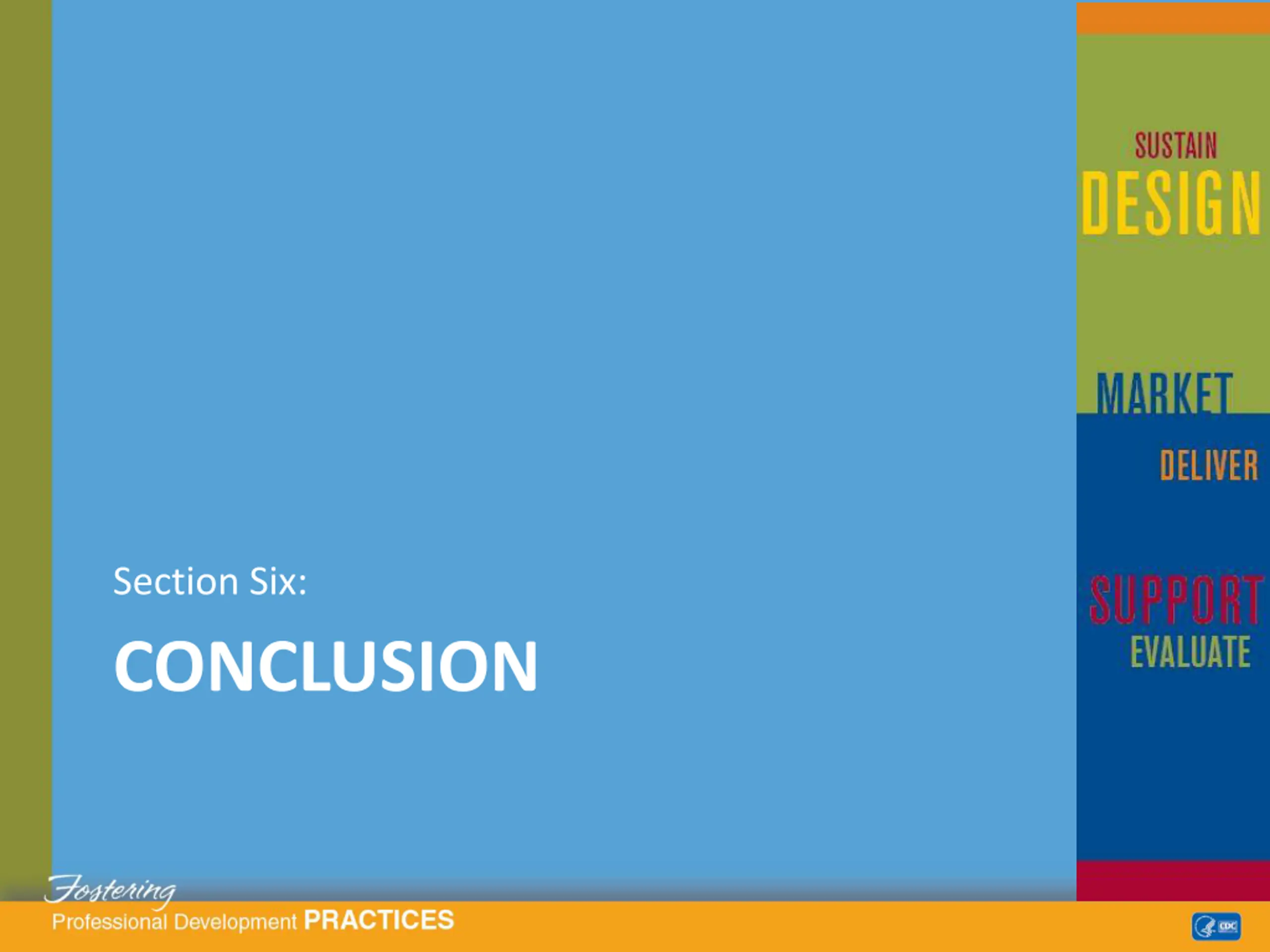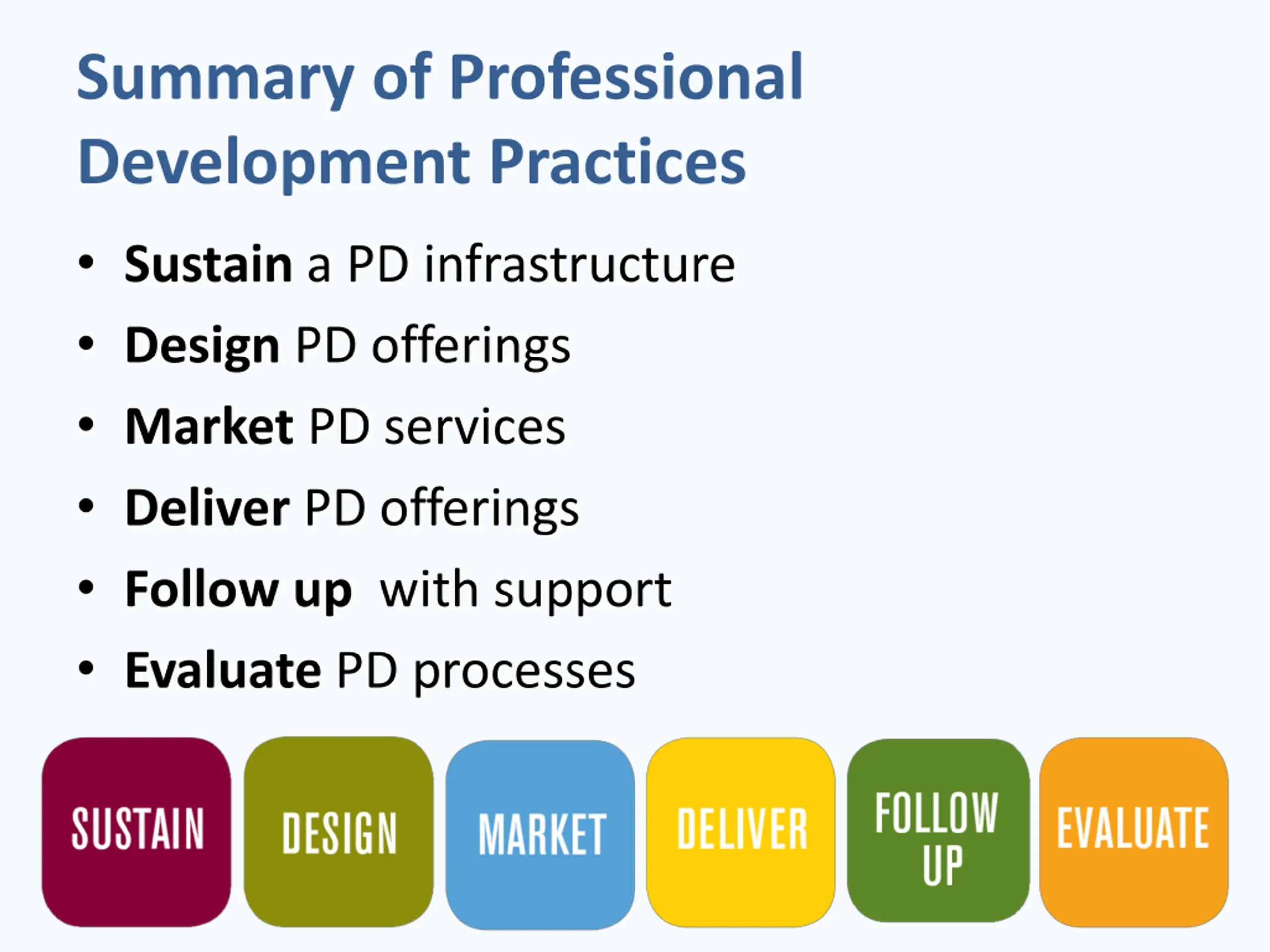 Summary of Professional Development Practices Sustain a PD infrastructure Design PD offerings Market PD services Deliver PD offerings Follow up with support Evaluate PD processes