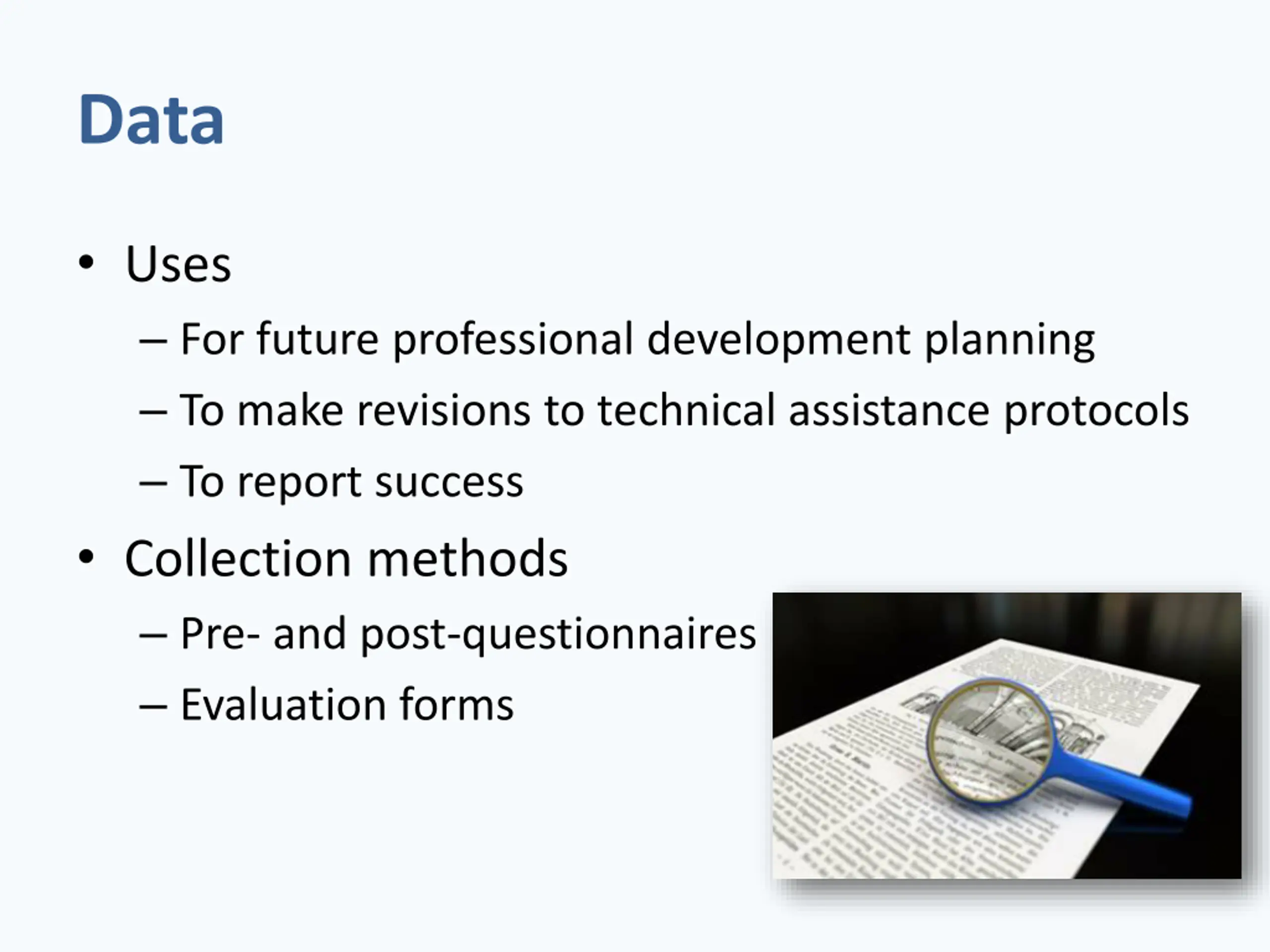 Data Uses For future professional development planning To make revisions to technical assistance protocols To report success Collection methods Pre- and post-questionnaires Evaluation forms