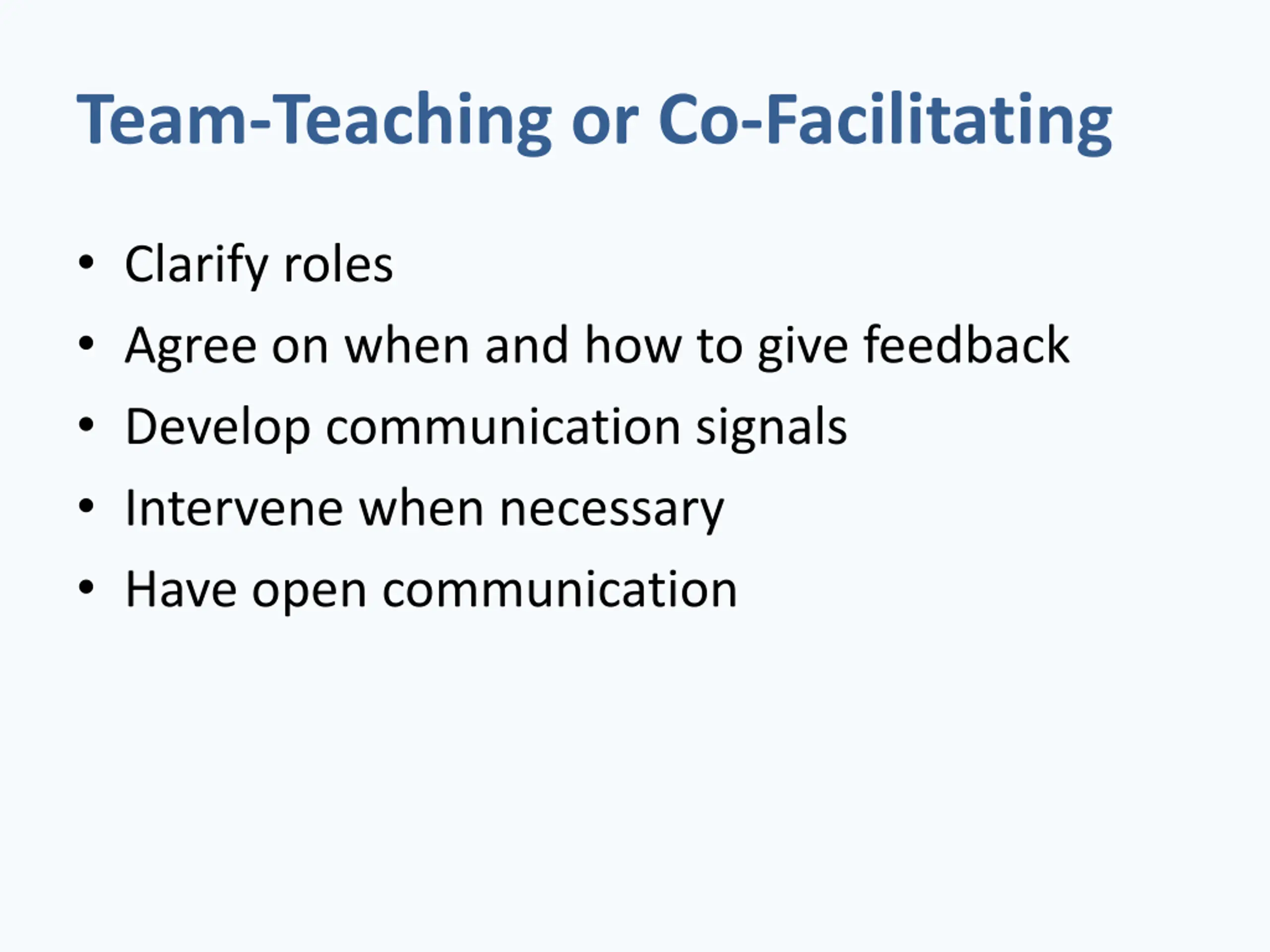 Team-Teaching or Co-Facilitating Clarify roles Agree on when and how to give feedback Develop communication signals Intervene when necessary Have open communication