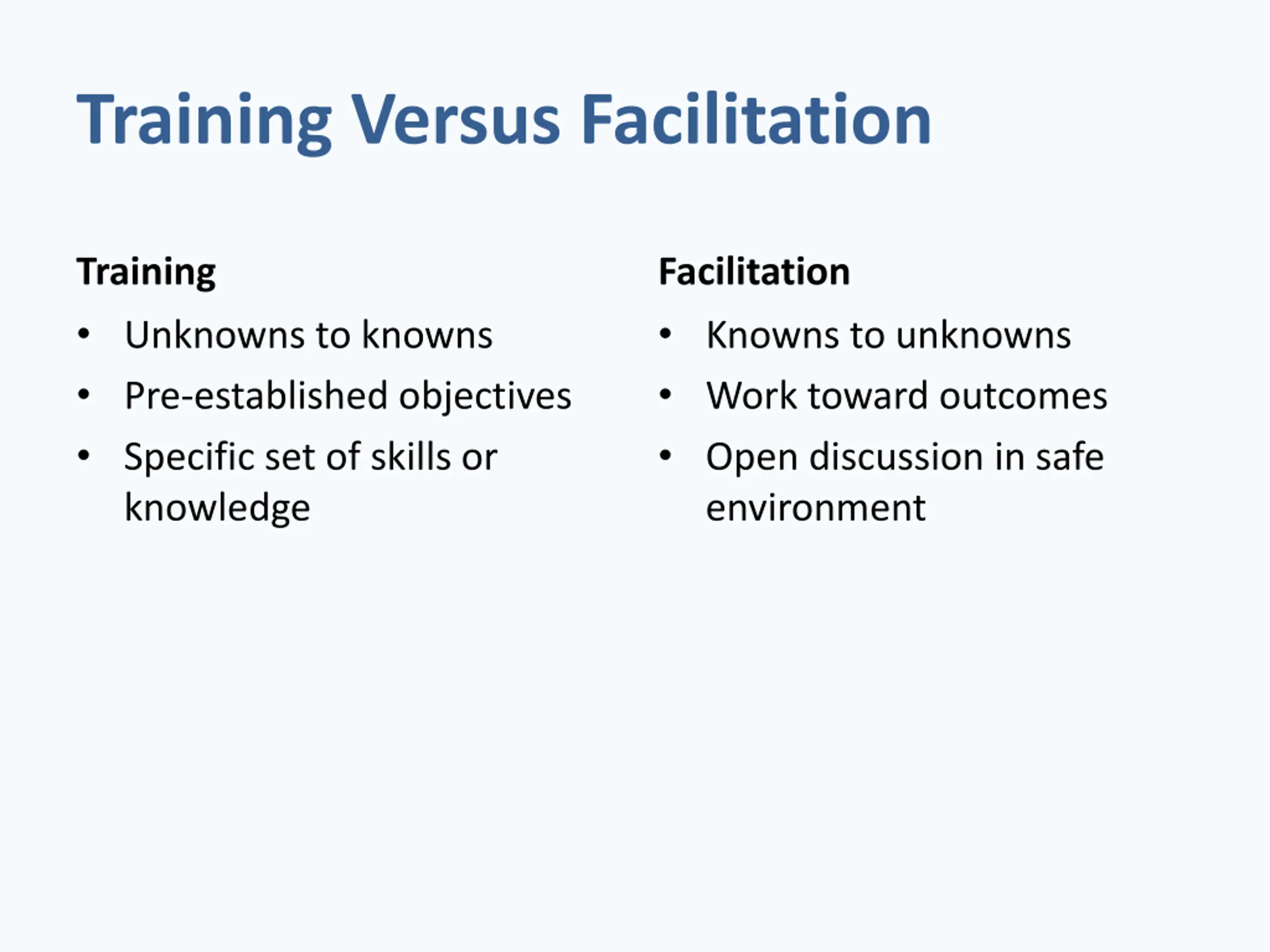 Training Versus Facilitation Training Unknowns to knowns Pre-established objectives Specific set of skills or knowledge Facilitation Knowns to unknowns Work toward outcomes Open discussion in safe environment