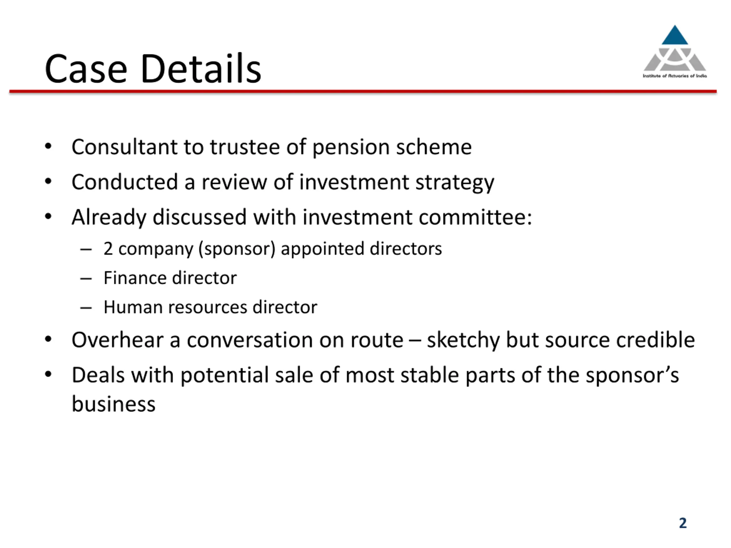 Case Details Consultant to trustee of pension scheme Conducted a review of investment strategy Already discussed with investment committee: 2 company (sponsor) appointed directors Finance director Human resources director Overhear a conversation on route sketchy but source credible Deals with potential sale of most stable parts of the sponsor s business 2