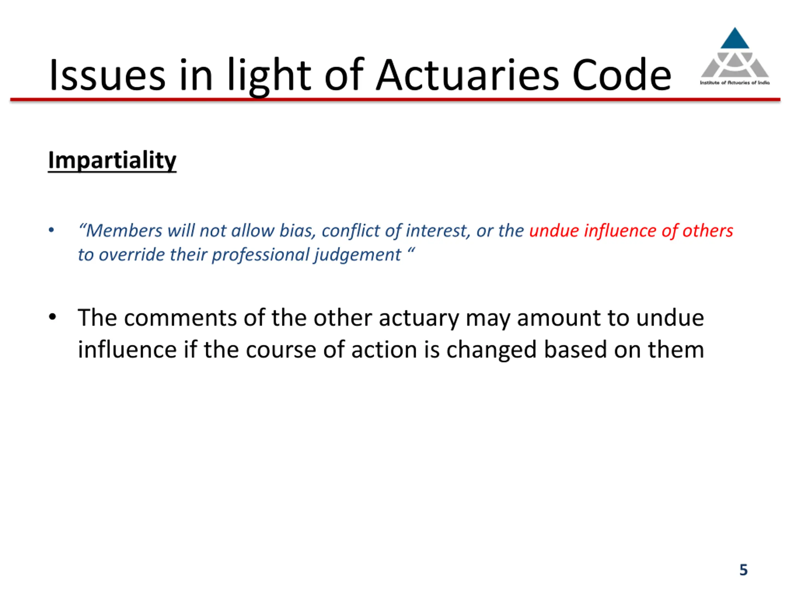Issues in light of Actuaries Code Impartiality Members will not allow bias, conflict of interest, or the undue influence of others to override their professional judgement The comments of the other actuary may amount to undue influence if the course of action is changed based on them 5