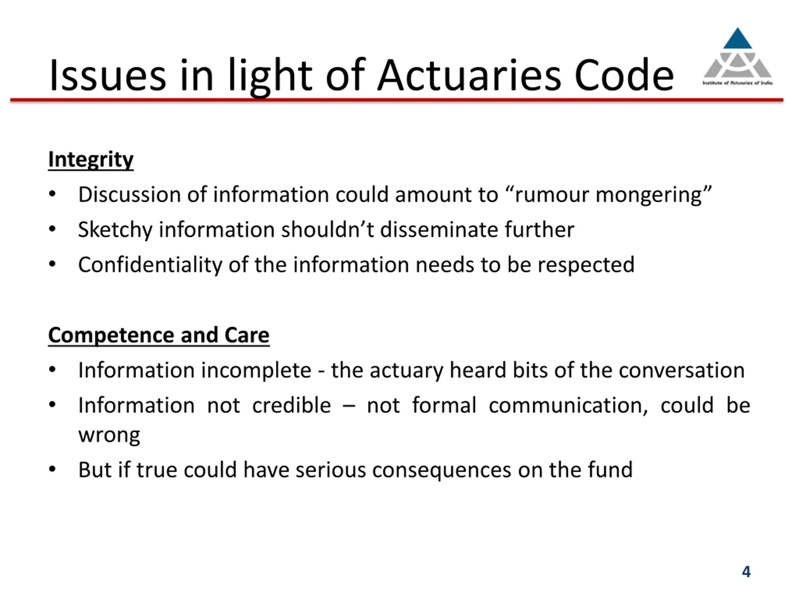 Issues in light of Actuaries Code Integrity Discussion of information could amount to rumour mongering Sketchy information shouldn t disseminate further Confidentiality of the information needs to be respected Competence and Care Information incomplete - the actuary heard bits of the conversation Information not credible not formal communication, could be wrong But if true could have serious consequences on the fund 4
