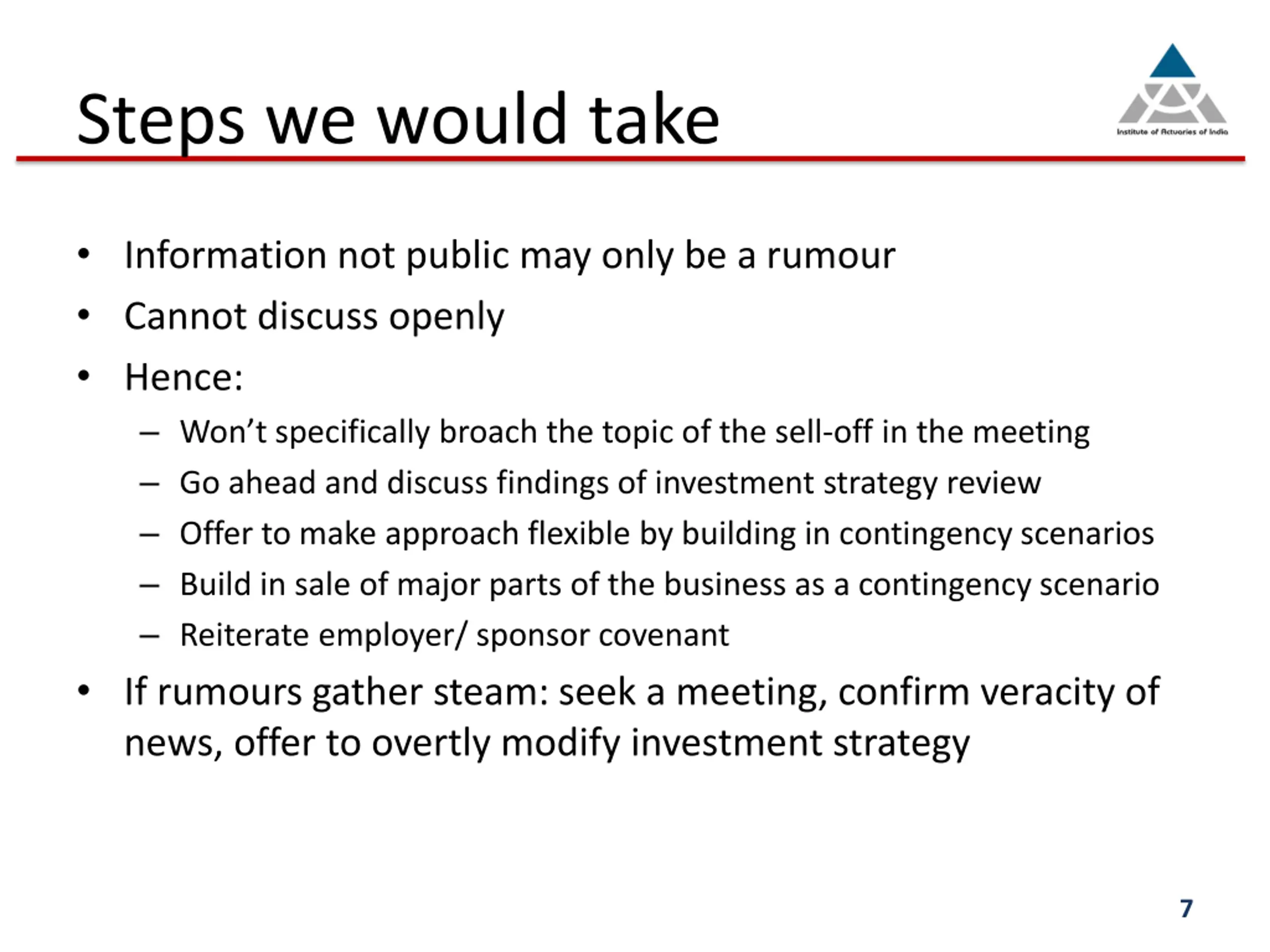 Steps we would take Information not public may only be a rumour Cannot discuss openly Hence: Won t specifically broach the topic of the sell-off in the meeting Go ahead and discuss findings of investment strategy review Offer to make approach flexible by building in contingency scenarios Build in sale of major parts of the business as a contingency scenario Reiterate employer/ sponsor covenant If rumours gather steam: seek a meeting, confirm veracity of news, offer to overtly modify investment strategy 7