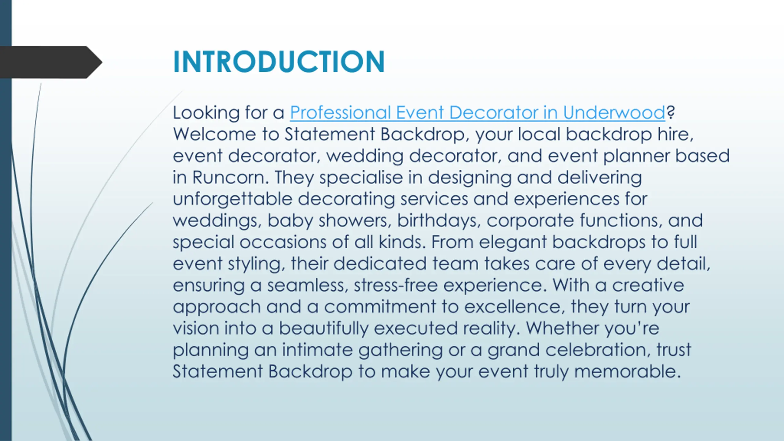 INTRODUCTION Looking for a Professional Event Decorator in Underwood? Welcome to Statement Backdrop, your local backdrop hire, event decorator, wedding decorator, and event planner based in Runcorn. They specialise in designing and delivering unforgettable decorating services and experiences for weddings, baby showers, birthdays, corporate functions, and special occasions of all kinds. From elegant backdrops to full event styling, their dedicated team takes care of every detail, ensuring a seamless, stress-free experience. With a creative approach and a commitment to excellence, they turn your vision into a beautifully executed reality. Whether you re planning an intimate gathering or a grand celebration, trust Statement Backdrop to make your event truly memorable.