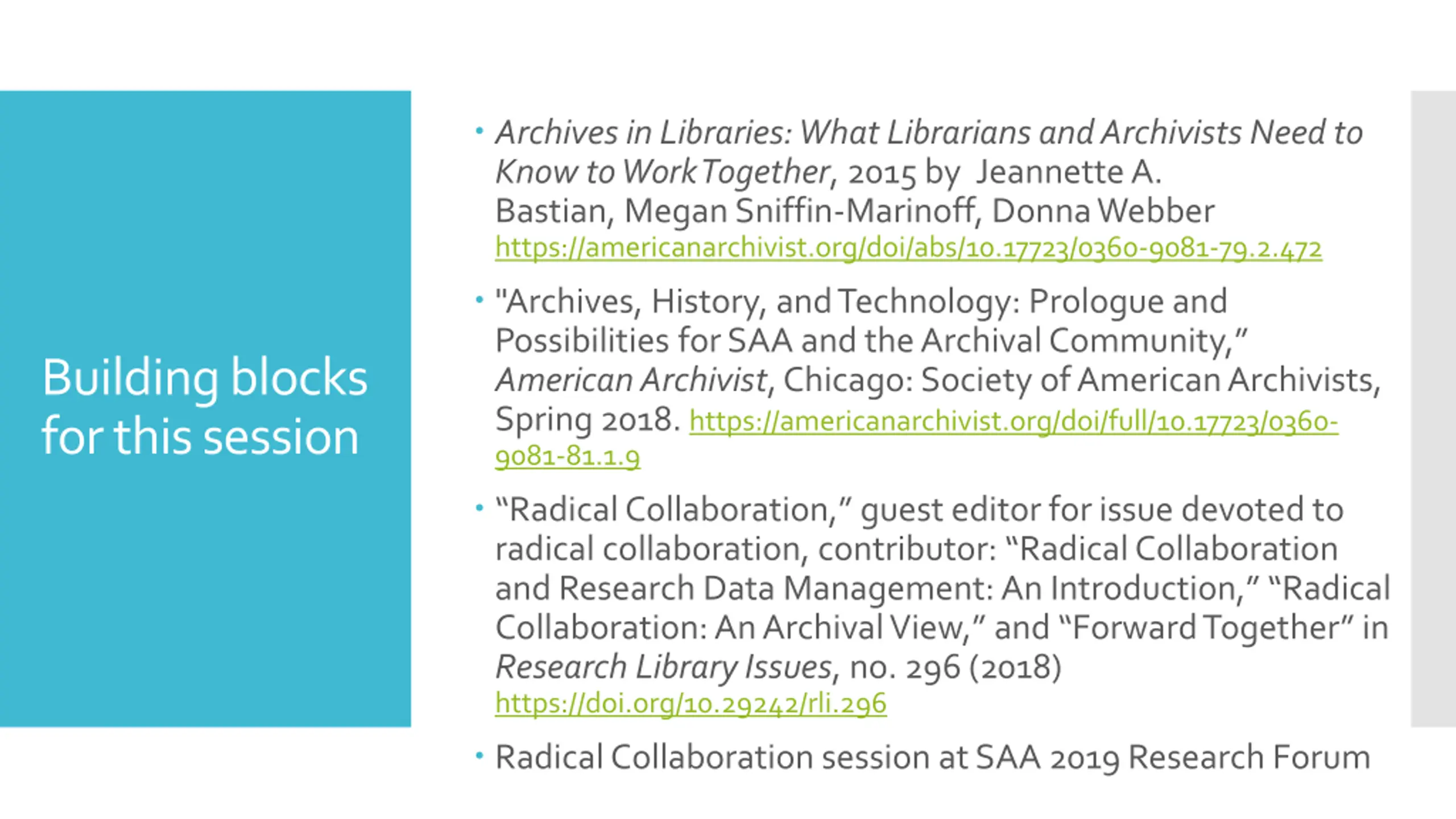 Archives in Libraries: What Librarians and Archivists Need to Know to Work Together, 2015 by Jeannette A. Bastian, Megan Sniffin-Marinoff, Donna Webber https://americanarchivist.org/doi/abs/10.17723/0360-9081-79.2.472 "Archives, History, and Technology: Prologue and Possibilities for SAA and the Archival Community, American Archivist, Chicago: Society of American Archivists, Spring 2018. https://americanarchivist.org/doi/full/10.17723/0360- 9081-81.1.9 Radical Collaboration, guest editor for issue devoted to radical collaboration, contributor: Radical Collaboration and Research Data Management: An Introduction, Radical Collaboration: An Archival View, and Forward Together in Research Library Issues, no. 296 (2018) https://doi.org/10.29242/rli.296 Radical Collaboration session at SAA 2019 Research Forum Building blocks for this session