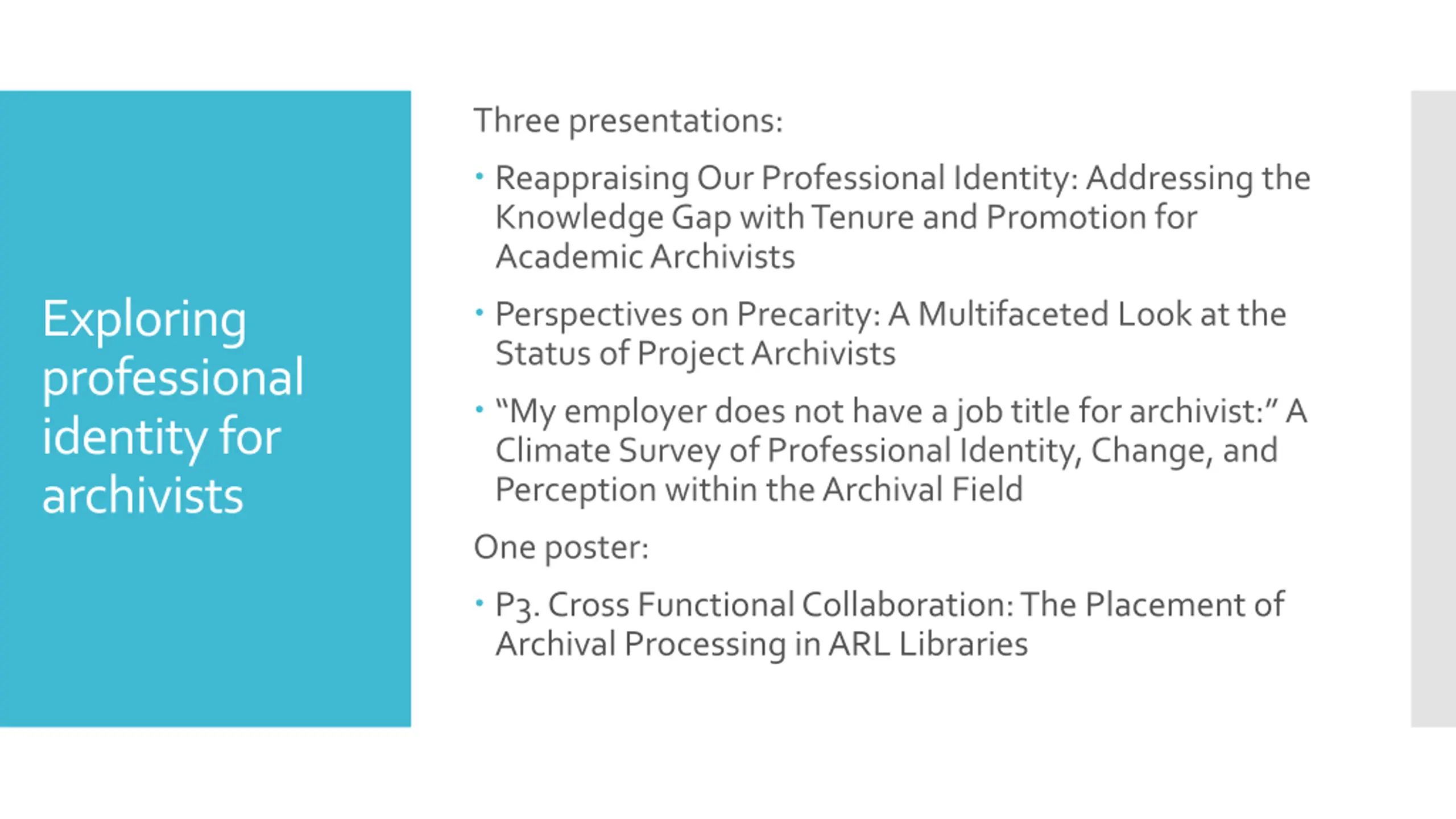 Three presentations: Reappraising Our Professional Identity: Addressing the Knowledge Gap with Tenure and Promotion for Academic Archivists Perspectives on Precarity: A Multifaceted Look at the Status of Project Archivists My employer does not have a job title for archivist: A Climate Survey of Professional Identity, Change, and Perception within the Archival Field Exploring professional identity for archivists One poster: P3. Cross Functional Collaboration: The Placement of Archival Processing in ARL Libraries