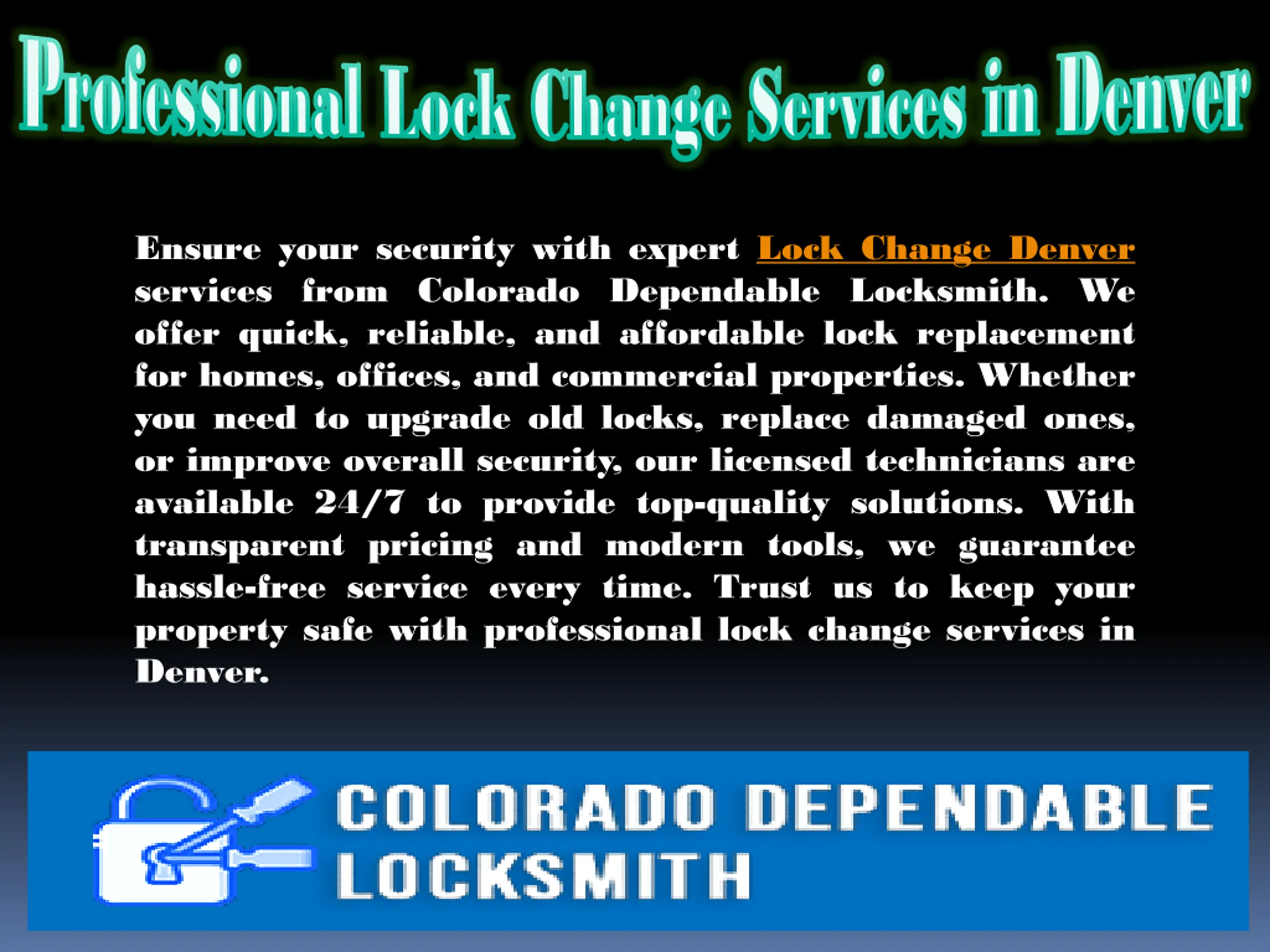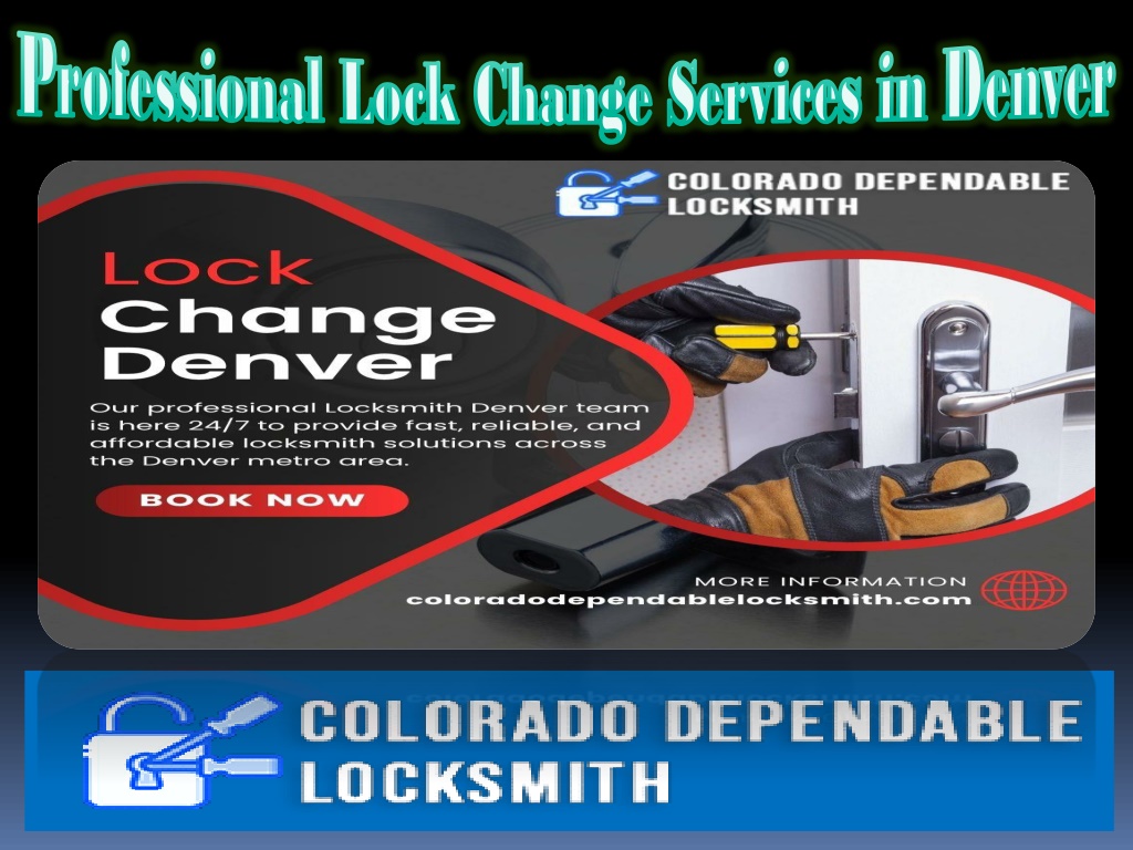 Professional Lock Change Services in Denver Professional Lock Change Services in Denver Ensure your security with expert Lock Change Denver services from Colorado Dependable Locksmith. We offer quick, reliable, and affordable lock replacement for homes, offices, and commercial properties. Whether you need to upgrade old locks, replace damaged ones, or improve overall security, our licensed technicians are available 24/7 to provide top-quality solutions. With transparent pricing and modern tools, we guarantee hassle-free service every time. Trust us to keep your property safe with professional lock change services in Denver.