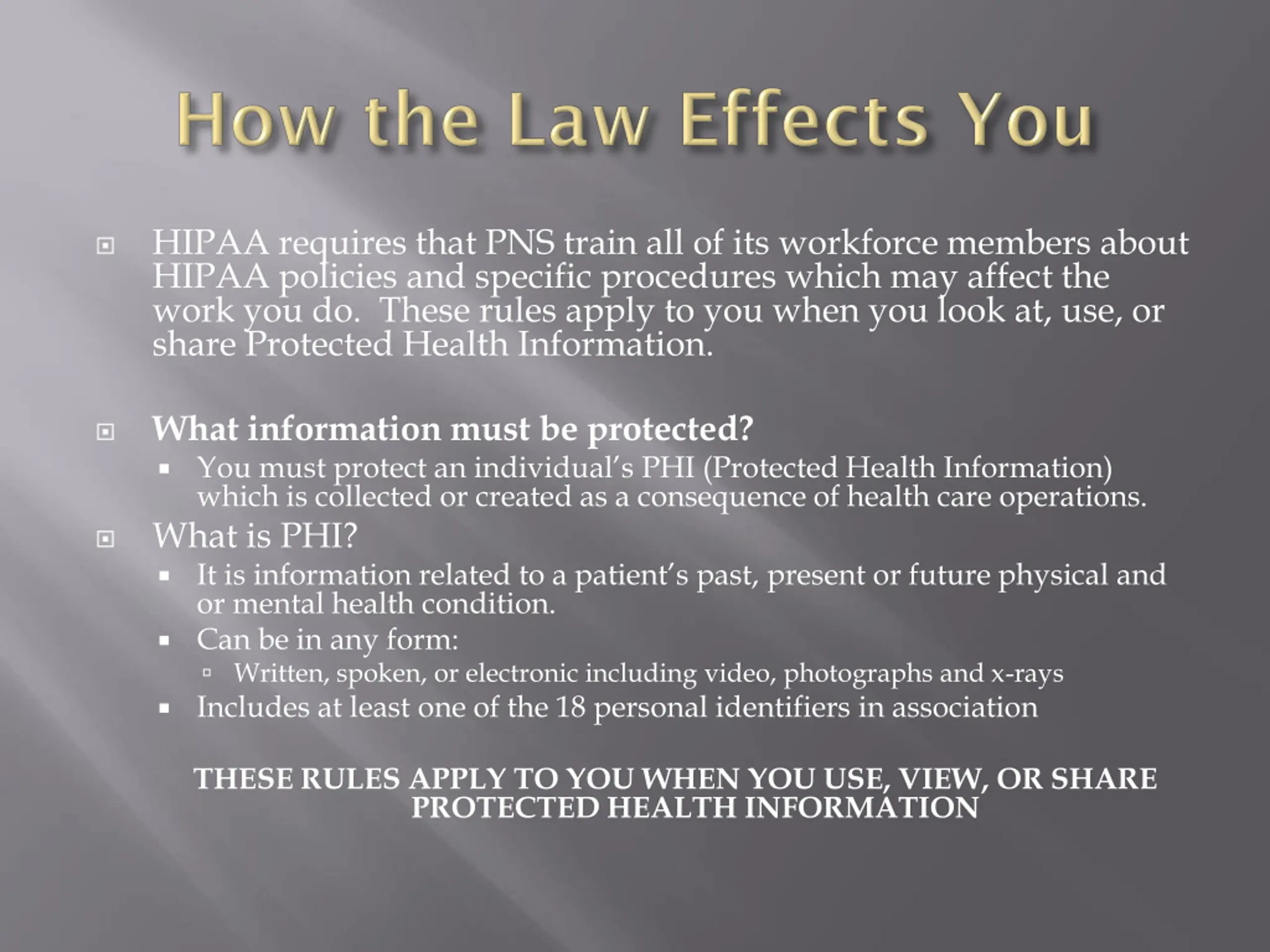 HIPAA requires that PNS train all of its workforce members about HIPAA policies and specific procedures which may affect the work you do. These rules apply to you when you look at, use, or share Protected Health Information. What information must be protected? You must protect an individual s PHI (Protected Health Information) which is collected or created as a consequence of health care operations. What is PHI? It is information related to a patient s past, present or future physical and or mental health condition. Can be in any form: Written, spoken, or electronic including video, photographs and x-rays Includes at least one of the 18 personal identifiers in association THESE RULES APPLY TO YOU WHEN YOU USE, VIEW, OR SHARE PROTECTED HEALTH INFORMATION