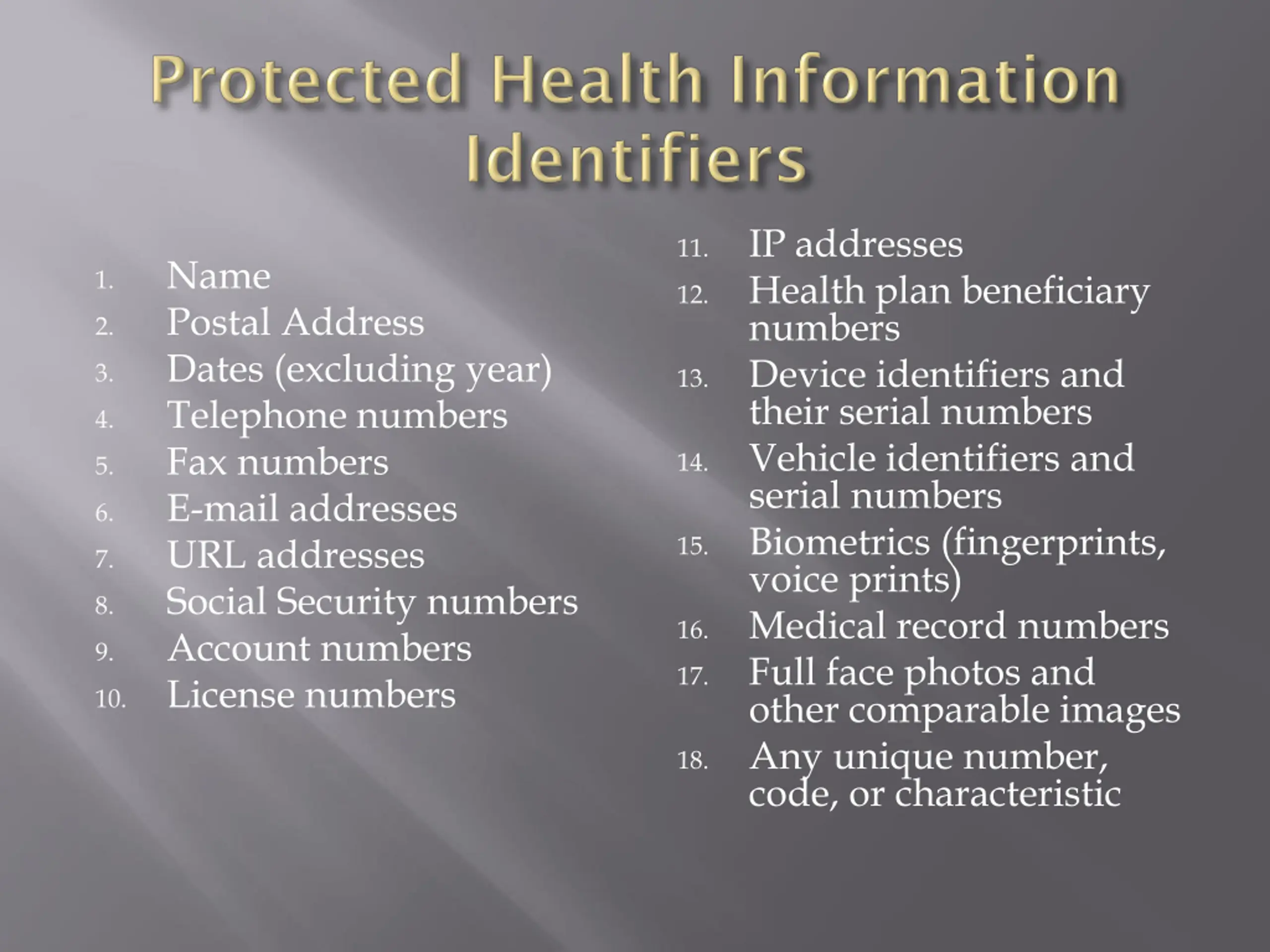IP addresses Health plan beneficiary numbers Device identifiers and their serial numbers Vehicle identifiers and serial numbers Biometrics (fingerprints, voice prints) Medical record numbers Full face photos and other comparable images Any unique number, code, or characteristic 11. Name Postal Address Dates (excluding year) Telephone numbers Fax numbers E-mail addresses URL addresses Social Security numbers Account numbers License numbers 1. 12. 2. 3. 13. 4. 14. 5. 6. 15. 7. 8. 16. 9. 17. 10. 18.