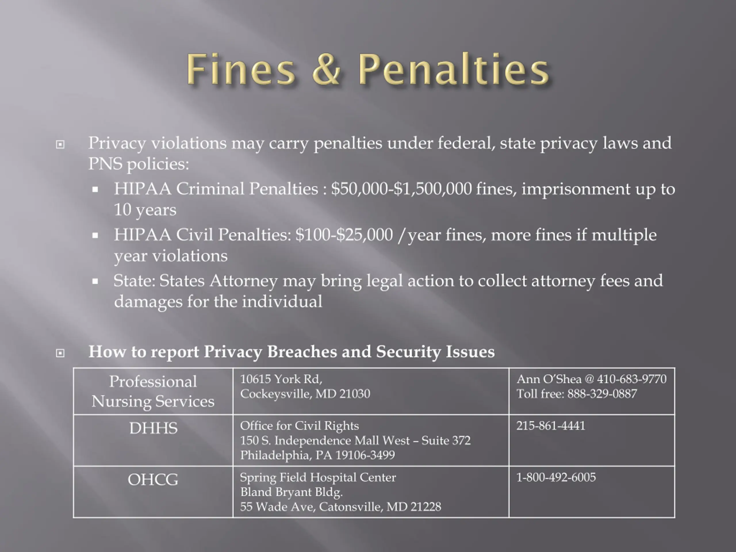 Privacy violations may carry penalties under federal, state privacy laws and PNS policies: HIPAA Criminal Penalties : $50,000-$1,500,000 fines, imprisonment up to 10 years HIPAA Civil Penalties: $100-$25,000 /year fines, more fines if multiple year violations State: States Attorney may bring legal action to collect attorney fees and damages for the individual How to report Privacy Breaches and Security Issues 10615 York Rd, Cockeysville, MD 21030 Ann O Shea @ 410-683-9770 Toll free: 888-329-0887 Professional Nursing Services DHHS Office for Civil Rights 150 S. Independence Mall West Suite 372 Philadelphia, PA 19106-3499 215-861-4441 Spring Field Hospital Center Bland Bryant Bldg. 55 Wade Ave, Catonsville, MD 21228 1-800-492-6005 OHCG