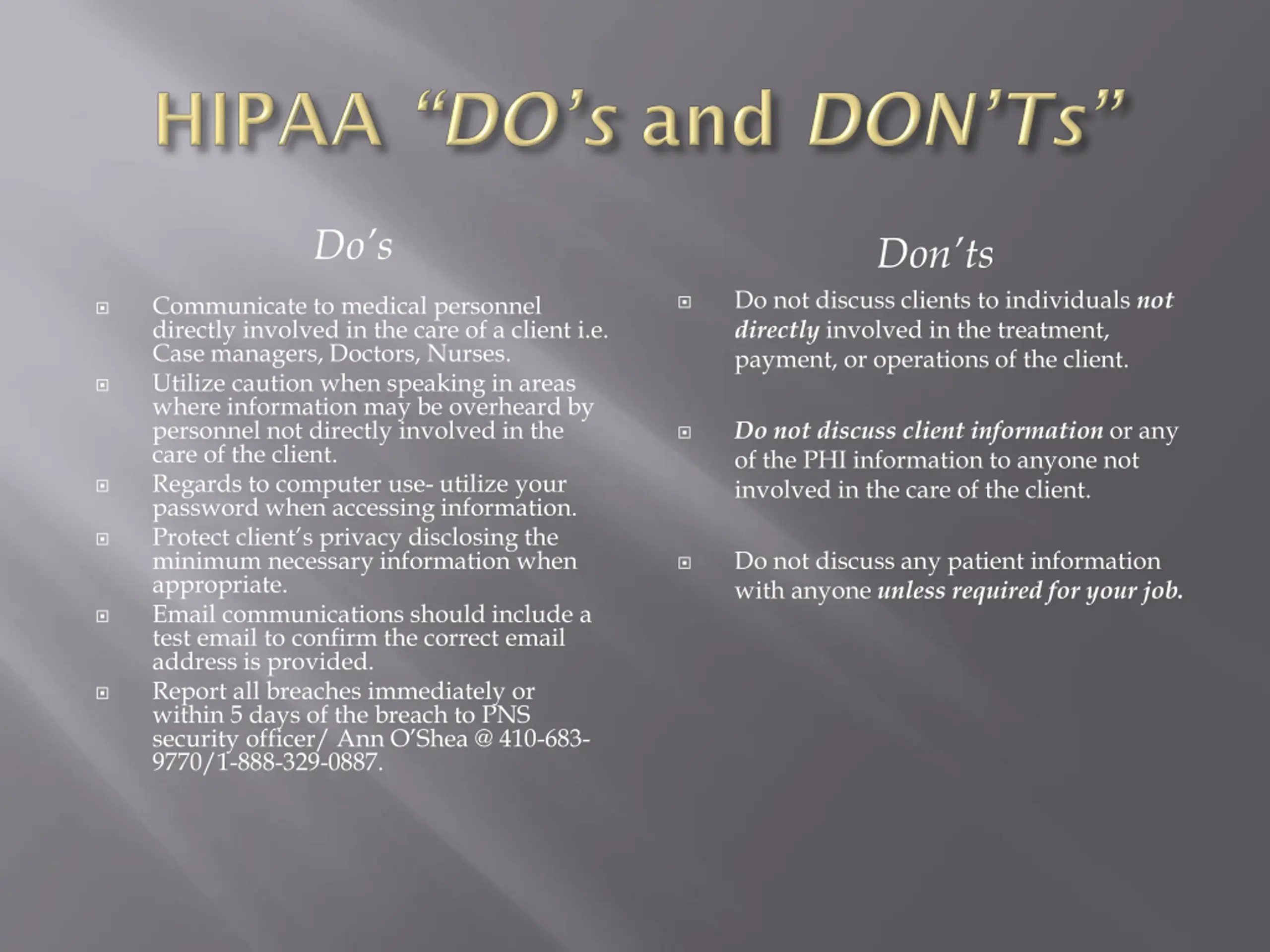 Dos Don ts Do not discuss clients to individuals not directly involved in the treatment, payment, or operations of the client. Communicate to medical personnel directly involved in the care of a client i.e. Case managers, Doctors, Nurses. Utilize caution when speaking in areas where information may be overheard by personnel not directly involved in the care of the client. Regards to computer use- utilize your password when accessing information. Protect client s privacy disclosing the minimum necessary information when appropriate. Email communications should include a test email to confirm the correct email address is provided. Report all breaches immediately or within 5 days of the breach to PNS security officer/ Ann O Shea @ 410-683- 9770/1-888-329-0887. Do not discuss client information or any of the PHI information to anyone not involved in the care of the client. Do not discuss any patient information with anyone unless required for your job.
