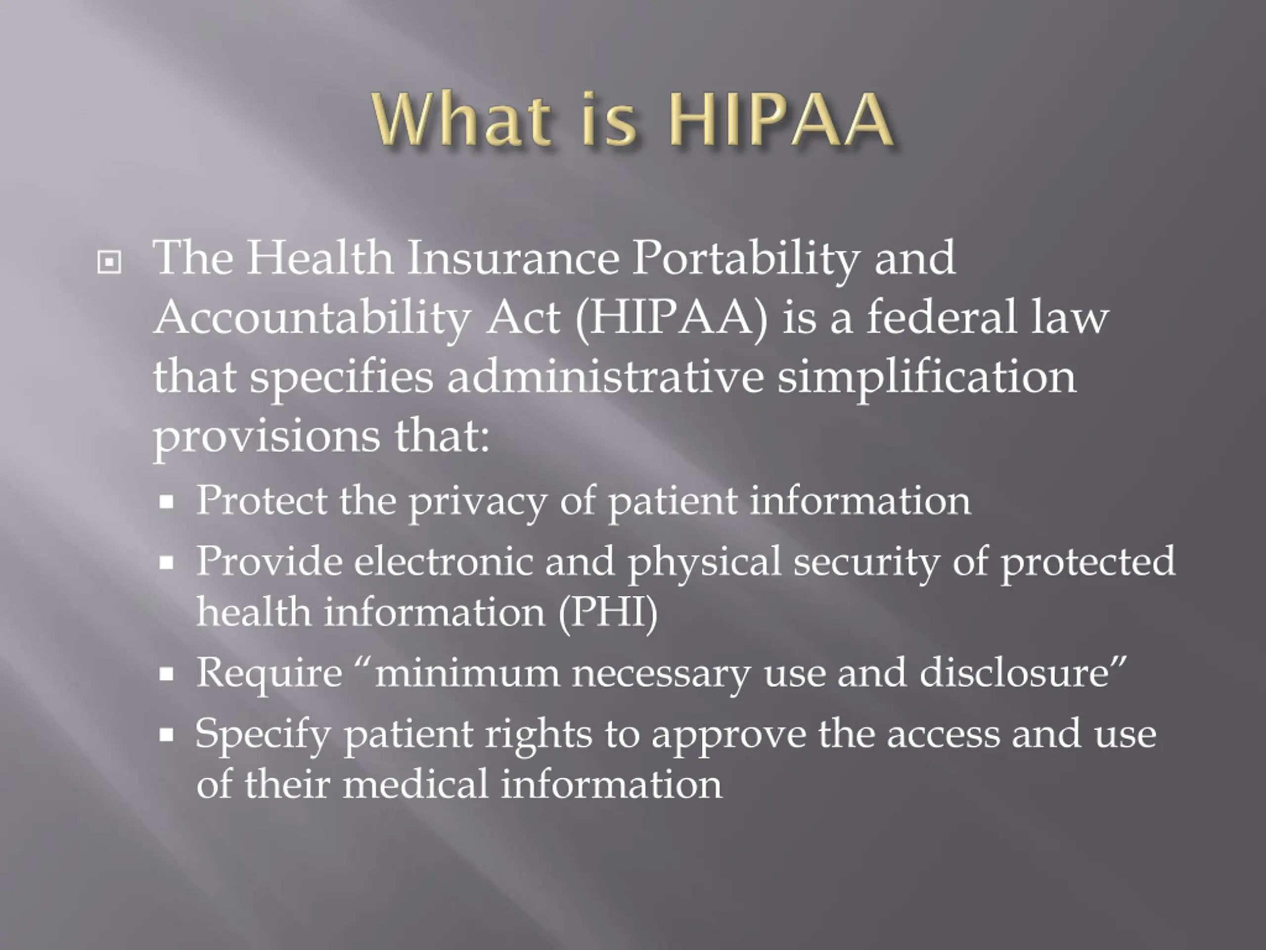 The Health Insurance Portability and Accountability Act (HIPAA) is a federal law that specifies administrative simplification provisions that: Protect the privacy of patient information Provide electronic and physical security of protected health information (PHI) Require minimum necessary use and disclosure Specify patient rights to approve the access and use of their medical information