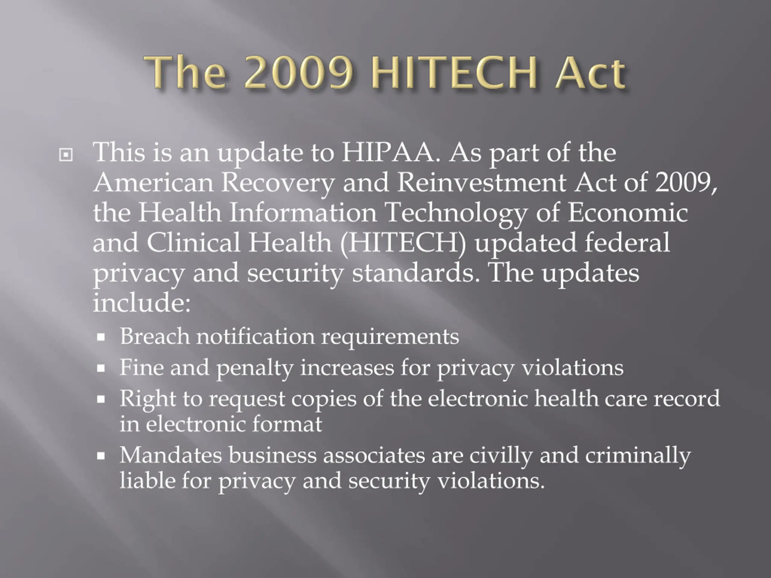 This is an update to HIPAA. As part of the American Recovery and Reinvestment Act of 2009, the Health Information Technology of Economic and Clinical Health (HITECH) updated federal privacy and security standards. The updates include: Breach notification requirements Fine and penalty increases for privacy violations Right to request copies of the electronic health care record in electronic format Mandates business associates are civilly and criminally liable for privacy and security violations.