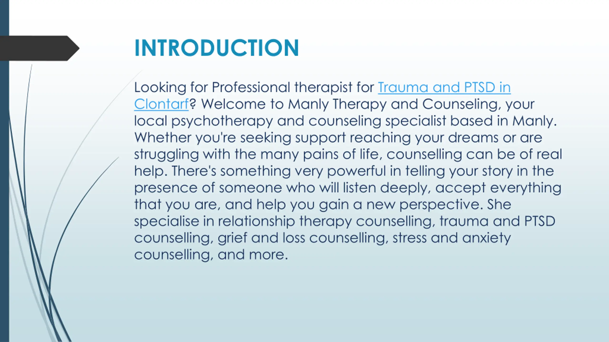 INTRODUCTION Looking for Professional therapist for Trauma and PTSD in Clontarf? Welcome to Manly Therapy and Counseling, your local psychotherapy and counseling specialist based in Manly. Whether you're seeking support reaching your dreams or are struggling with the many pains of life, counselling can be of real help. There's something very powerful in telling your story in the presence of someone who will listen deeply, accept everything that you are, and help you gain a new perspective. She specialise in relationship therapy counselling, trauma and PTSD counselling, grief and loss counselling, stress and anxiety counselling, and more.