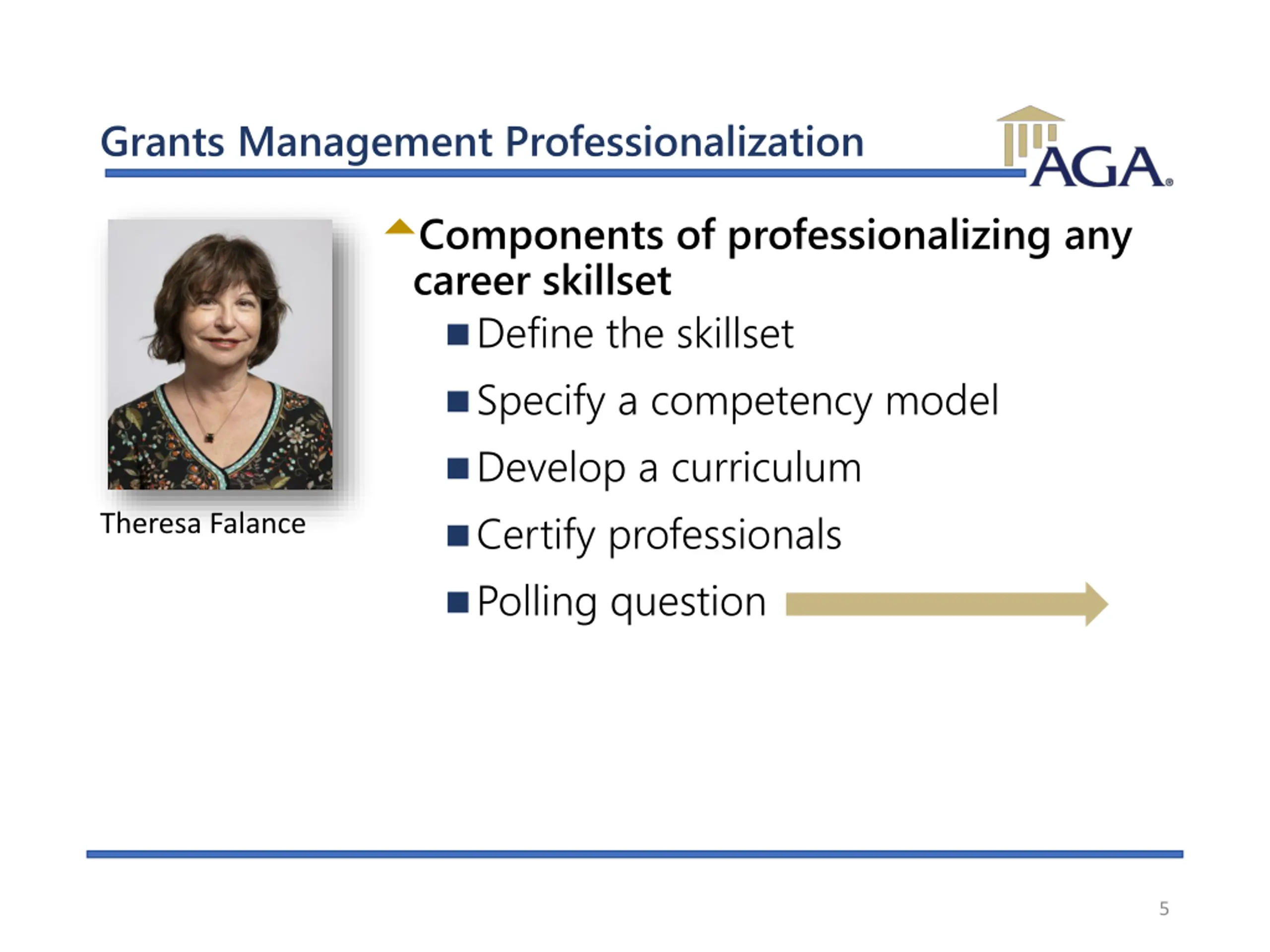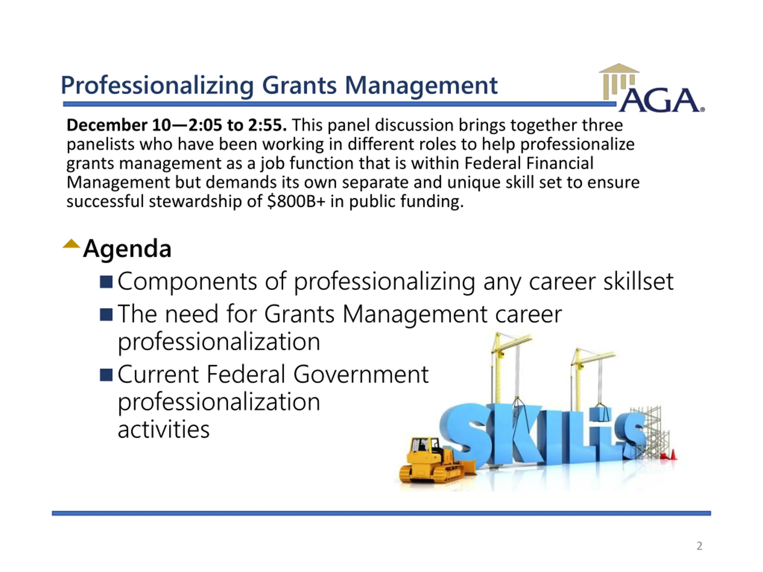 Professionalizing Grants Management December 10 2:05 to 2:55. This panel discussion brings together three panelists who have been working in different roles to help professionalize grants management as a job function that is within Federal Financial Management but demands its own separate and unique skill set to ensure successful stewardship of $800B+ in public funding. Agenda Components of professionalizing any career skillset The need for Grants Management career professionalization Current Federal Government professionalization activities 2