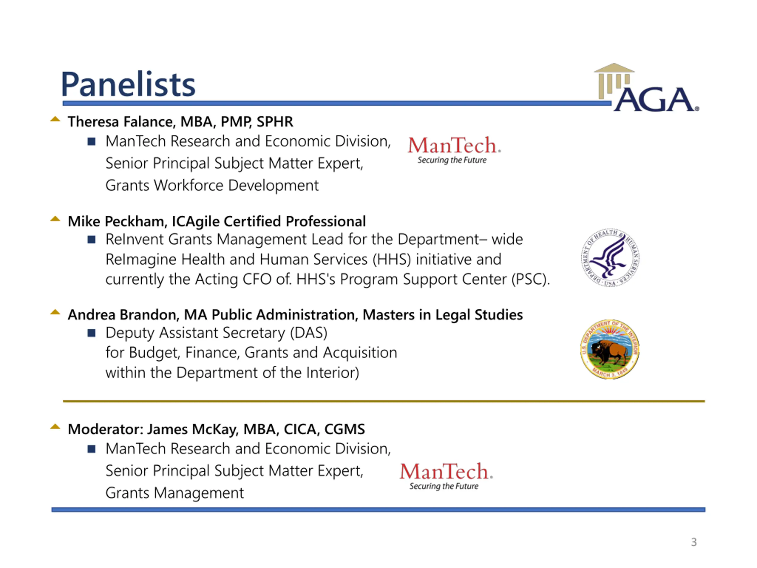 Panelists Theresa Falance, MBA, PMP, SPHR ManTech Research and Economic Division, Senior Principal Subject Matter Expert, Grants Workforce Development Mike Peckham, ICAgile Certified Professional ReInvent Grants Management Lead for the Department wide ReImagine Health and Human Services (HHS) initiative and currently the Acting CFO of. HHS's Program Support Center (PSC). Andrea Brandon, MA Public Administration, Masters in Legal Studies Deputy Assistant Secretary (DAS) for Budget, Finance, Grants and Acquisition within the Department of the Interior) Moderator: James McKay, MBA, CICA, CGMS ManTech Research and Economic Division, Senior Principal Subject Matter Expert, Grants Management 3