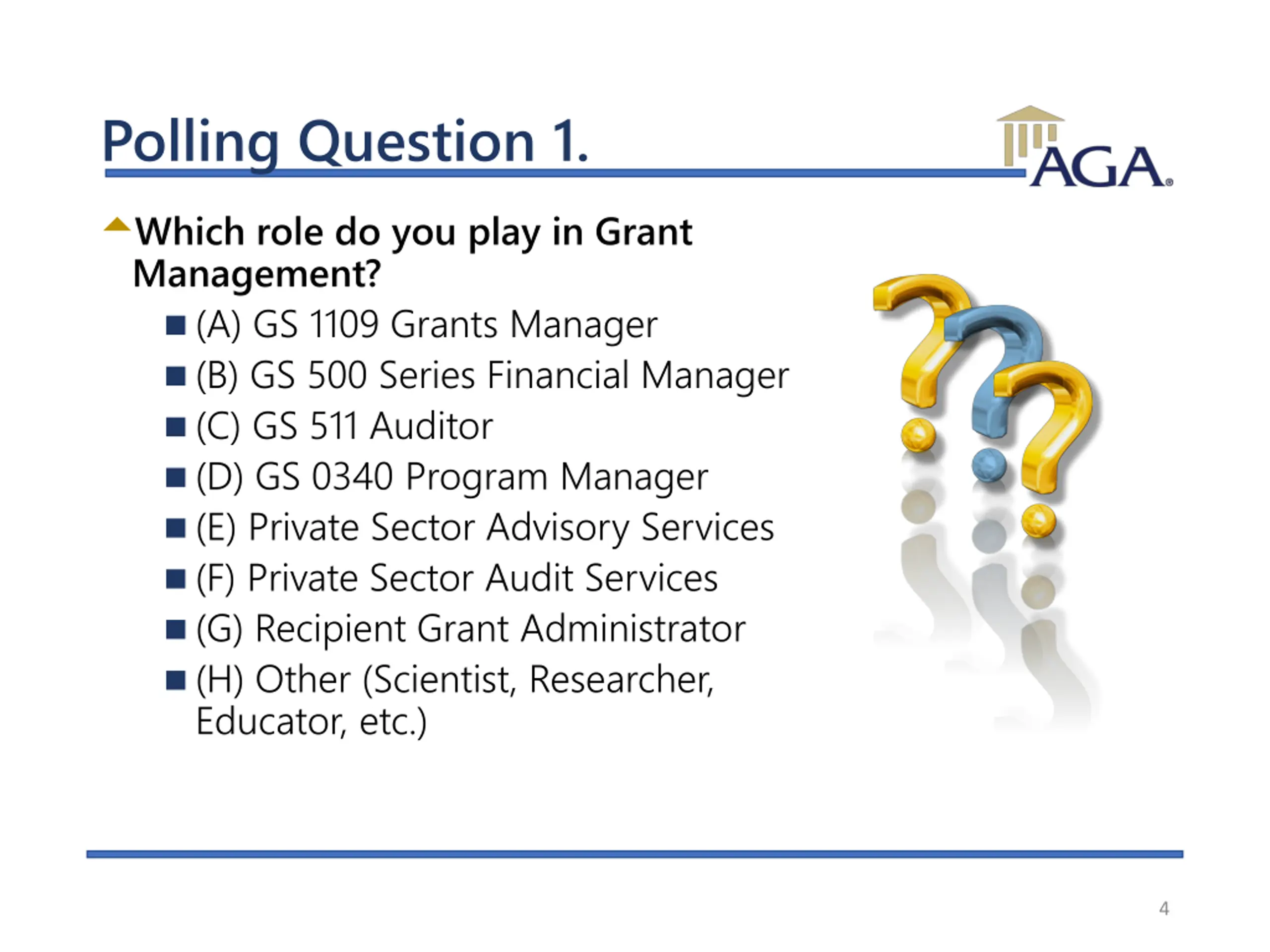Polling Question 1. Which role do you play in Grant Management? (A) GS 1109 Grants Manager (B) GS 500 Series Financial Manager (C) GS 511 Auditor (D) GS 0340 Program Manager (E) Private Sector Advisory Services (F) Private Sector Audit Services (G) Recipient Grant Administrator (H) Other (Scientist, Researcher, Educator, etc.) 4