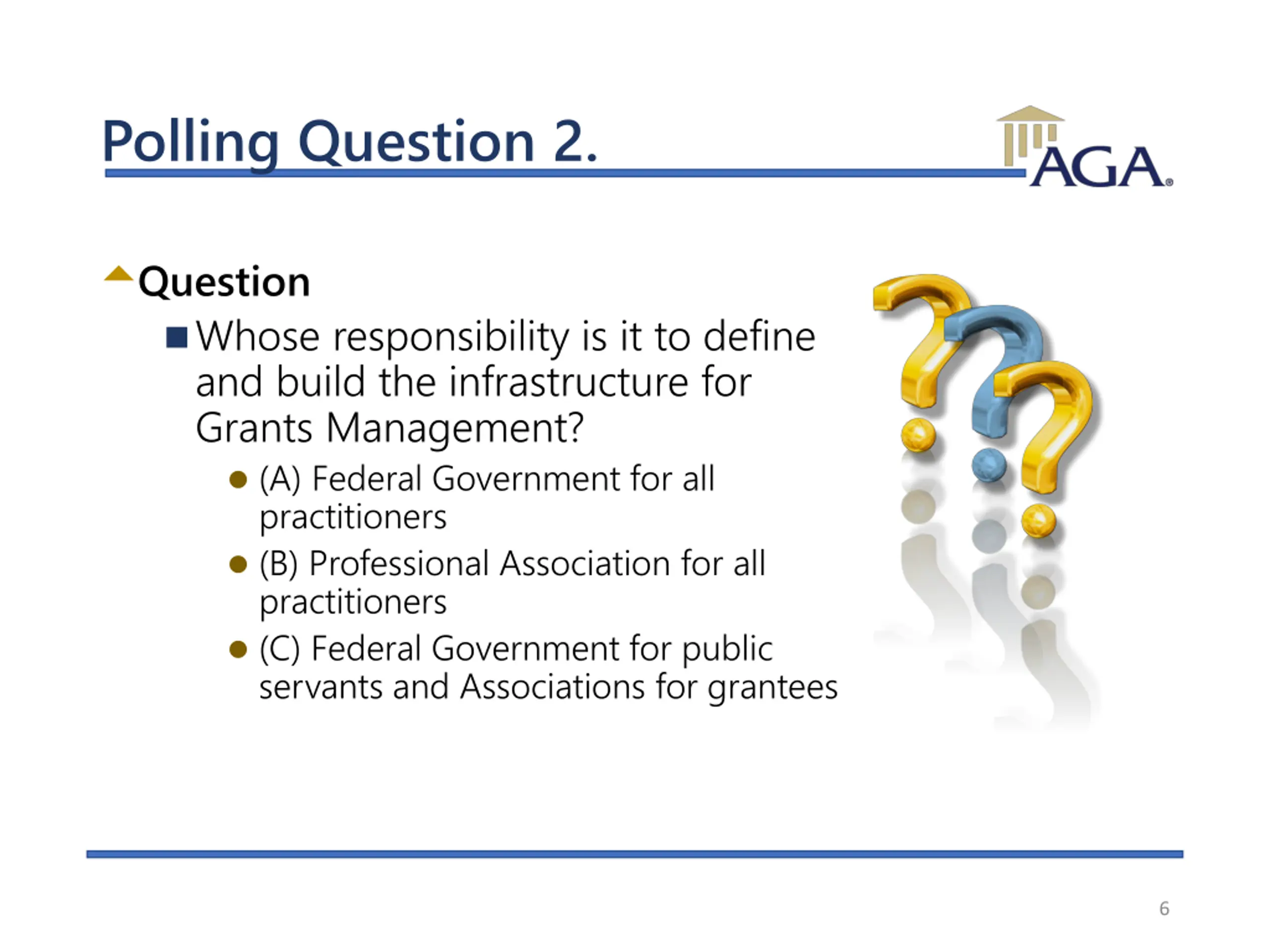 Polling Question 2. Question Whose responsibility is it to define and build the infrastructure for Grants Management? (A) Federal Government for all practitioners (B) Professional Association for all practitioners (C) Federal Government for public servants and Associations for grantees 6