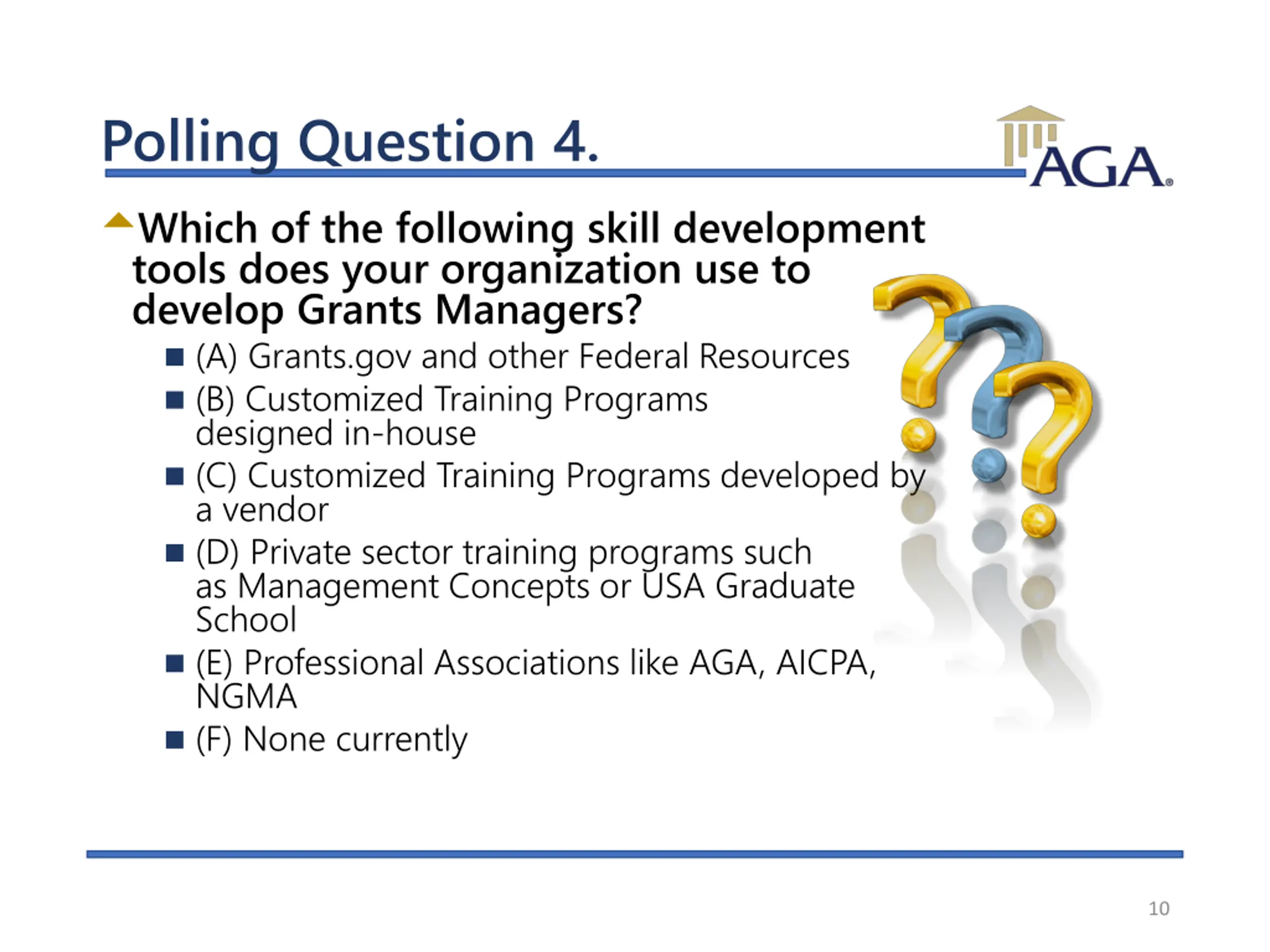 Polling Question 4. Which of the following skill development tools does your organization use to develop Grants Managers? (A) Grants.gov and other Federal Resources (B) Customized Training Programs designed in-house (C) Customized Training Programs developed by a vendor (D) Private sector training programs such as Management Concepts or USA Graduate School (E) Professional Associations like AGA, AICPA, NGMA (F) None currently 10