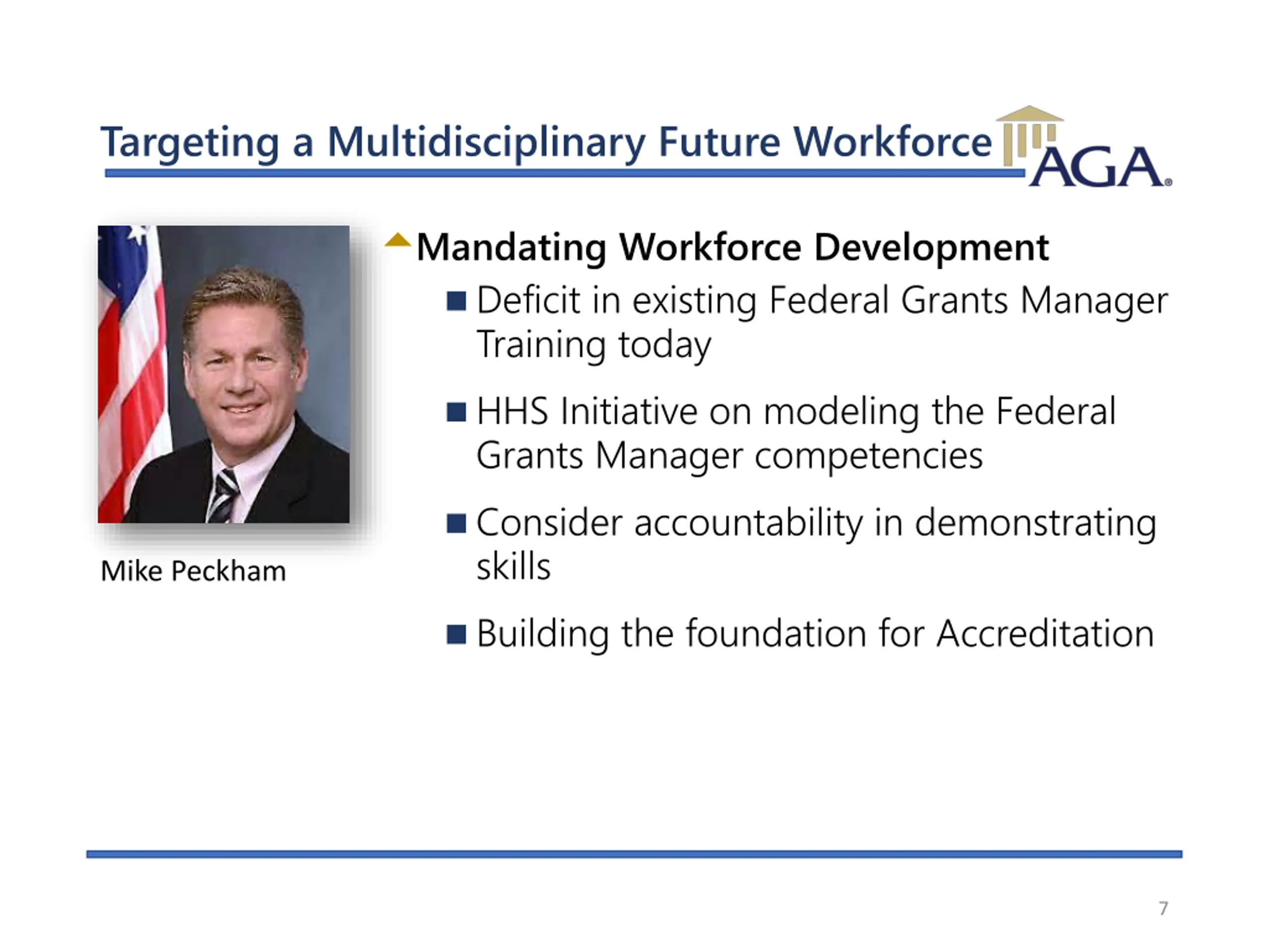 Targeting a Multidisciplinary Future Workforce Mandating Workforce Development Deficit in existing Federal Grants Manager Training today HHS Initiative on modeling the Federal Grants Manager competencies Consider accountability in demonstrating skills Building the foundation for Accreditation Mike Peckham 7