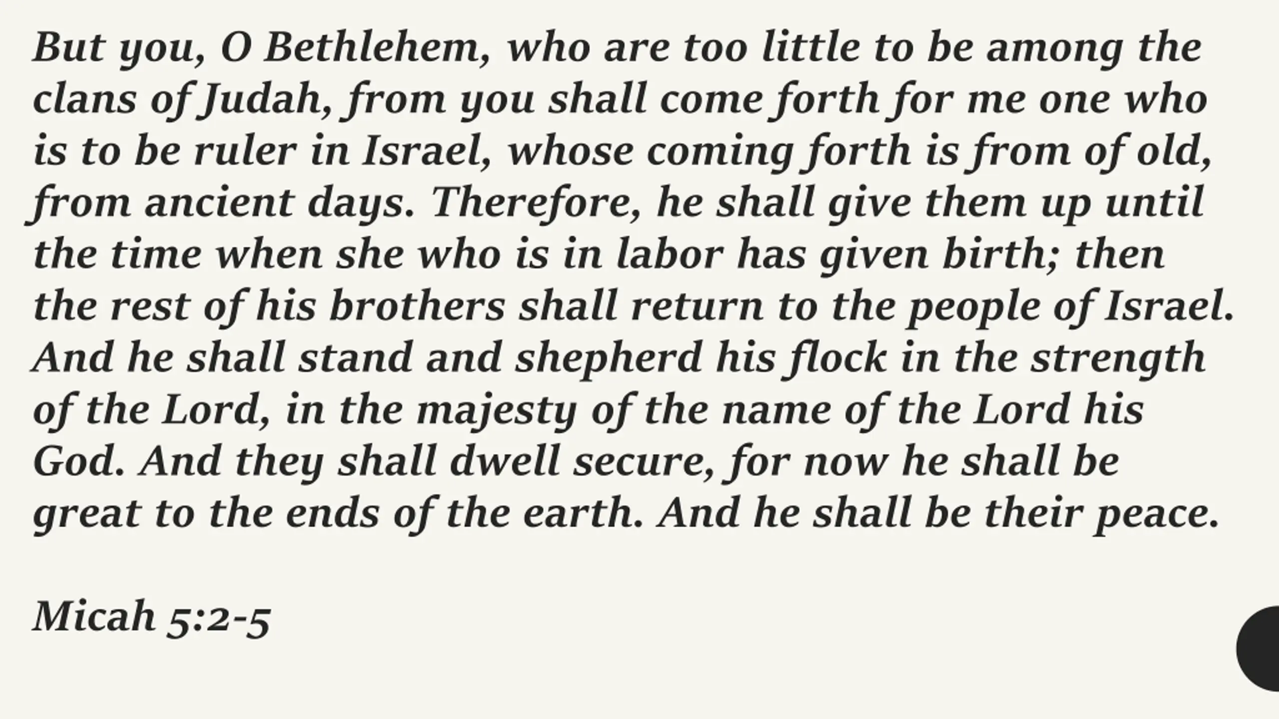 But you, O Bethlehem, who are too little to be among the clans of Judah, from you shall come forth for me one who is to be ruler in Israel, whose coming forth is from of old, from ancient days. Therefore, he shall give them up until the time when she who is in labor has given birth; then the rest of his brothers shall return to the people of Israel. And he shall stand and shepherd his flock in the strength of the Lord, in the majesty of the name of the Lord his God. And they shall dwell secure, for now he shall be great to the ends of the earth. And he shall be their peace. Micah 5:2-5