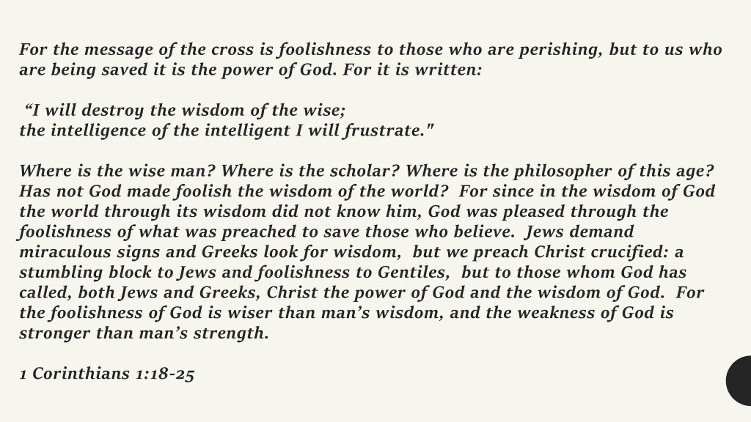 For the message of the cross is foolishness to those who are perishing, but to us who are being saved it is the power of God. For it is written: I will destroy the wisdom of the wise; the intelligence of the intelligent I will frustrate." Where is the wise man? Where is the scholar? Where is the philosopher of this age? Has not God made foolish the wisdom of the world? For since in the wisdom of God the world through its wisdom did not know him, God was pleased through the foolishness of what was preached to save those who believe. Jews demand miraculous signs and Greeks look for wisdom, but we preach Christ crucified: a stumbling block to Jews and foolishness to Gentiles, but to those whom God has called, both Jews and Greeks, Christ the power of God and the wisdom of God. For the foolishness of God is wiser than man s wisdom, and the weakness of God is stronger than man s strength. 1 Corinthians 1:18-25