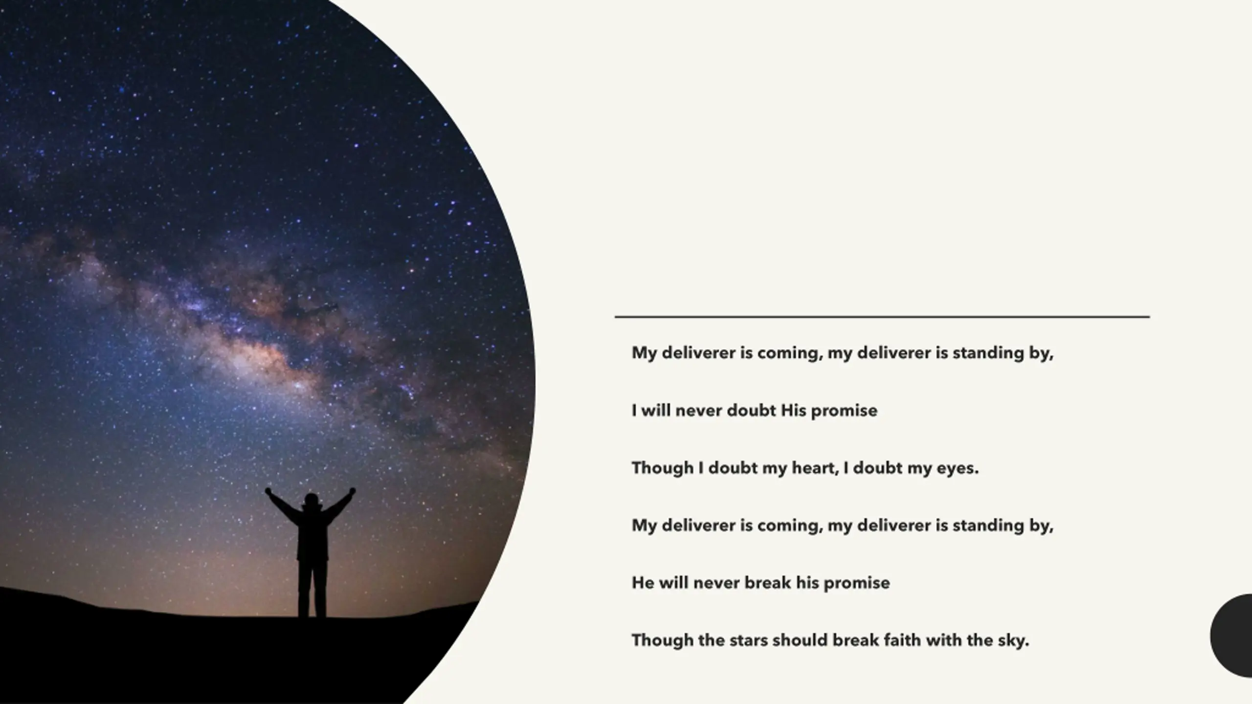 My deliverer is coming, my deliverer is standing by, I will never doubt His promise Though I doubt my heart, I doubt my eyes. My deliverer is coming, my deliverer is standing by, He will never break his promise Though the stars should break faith with the sky.