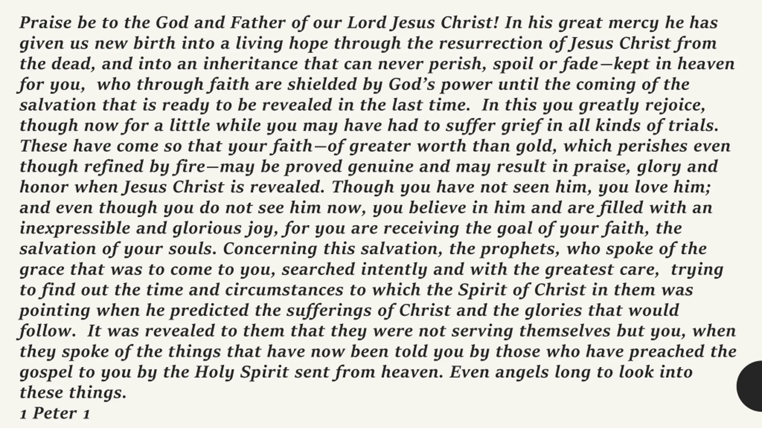 Praise be to the God and Father of our Lord Jesus Christ! In his great mercy he has given us new birth into a living hope through the resurrection of Jesus Christ from the dead, and into an inheritance that can never perish, spoil or fade kept in heaven for you, who through faith are shielded by God s power until the coming of the salvation that is ready to be revealed in the last time. In this you greatly rejoice, though now for a little while you may have had to suffer grief in all kinds of trials. These have come so that your faith of greater worth than gold, which perishes even though refined by fire may be proved genuine and may result in praise, glory and honor when Jesus Christ is revealed. Though you have not seen him, you love him; and even though you do not see him now, you believe in him and are filled with an inexpressible and glorious joy, for you are receiving the goal of your faith, the salvation of your souls. Concerning this salvation, the prophets, who spoke of the grace that was to come to you, searched intently and with the greatest care, trying to find out the time and circumstances to which the Spirit of Christ in them was pointing when he predicted the sufferings of Christ and the glories that would follow. It was revealed to them that they were not serving themselves but you, when they spoke of the things that have now been told you by those who have preached the gospel to you by the Holy Spirit sent from heaven. Even angels long to look into these things. 1 Peter 1