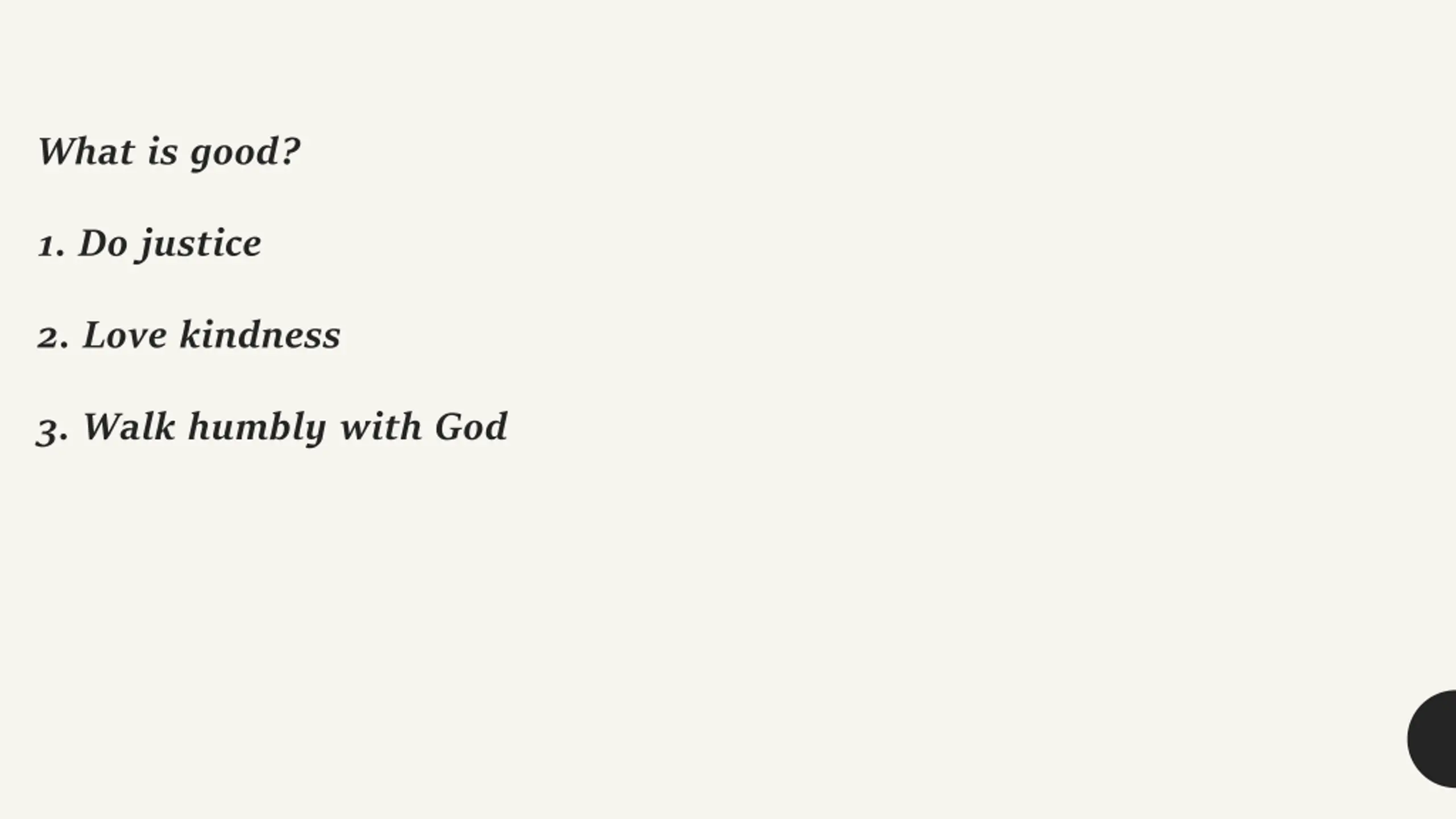 What is good? 1. Do justice 2. Love kindness 3. Walk humbly with God