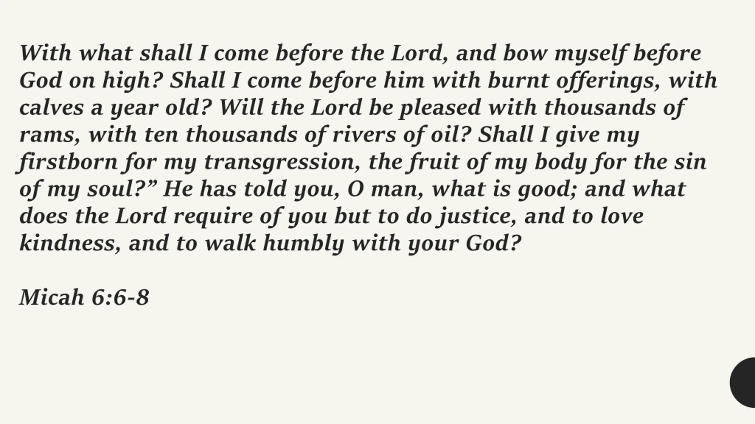 With what shall I come before the Lord, and bow myself before God on high? Shall I come before him with burnt offerings, with calves a year old? Will the Lord be pleased with thousands of rams, with ten thousands of rivers of oil? Shall I give my firstborn for my transgression, the fruit of my body for the sin of my soul? He has told you, O man, what is good; and what does the Lord require of you but to do justice, and to love kindness, and to walk humbly with your God? Micah 6:6-8