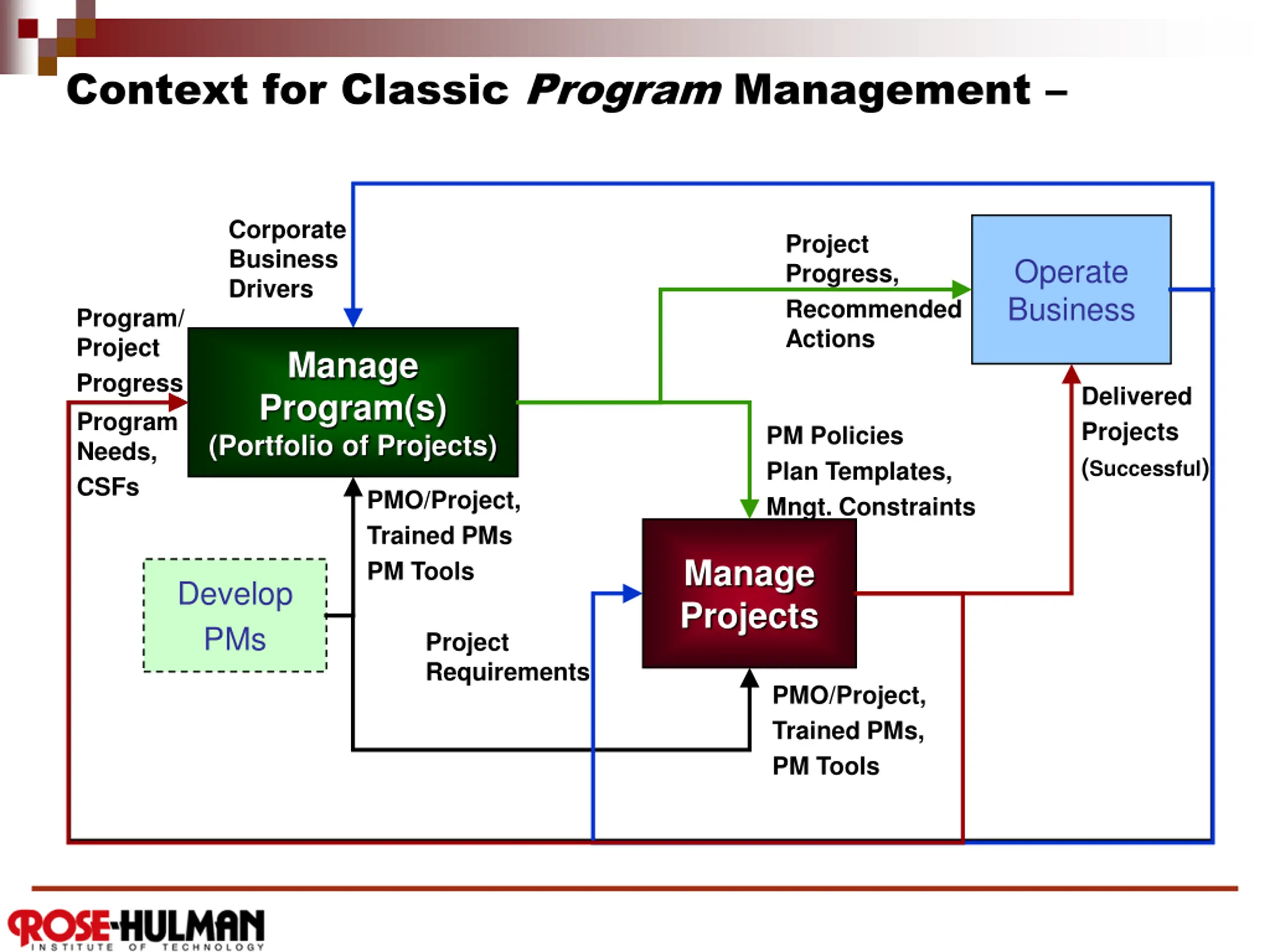 Context for Classic Program Management Corporate Business Drivers Project Progress, Recommended Actions Operate Business Program/ Project Progress Manage Program(s) (Portfolio of Projects) Delivered Projects (Successful) Program Needs, CSFs PM Policies Plan Templates, Mngt. Constraints PMO/Project, Trained PMs PM Tools Manage Projects Develop PMs Project Requirements PMO/Project, Trained PMs, PM Tools