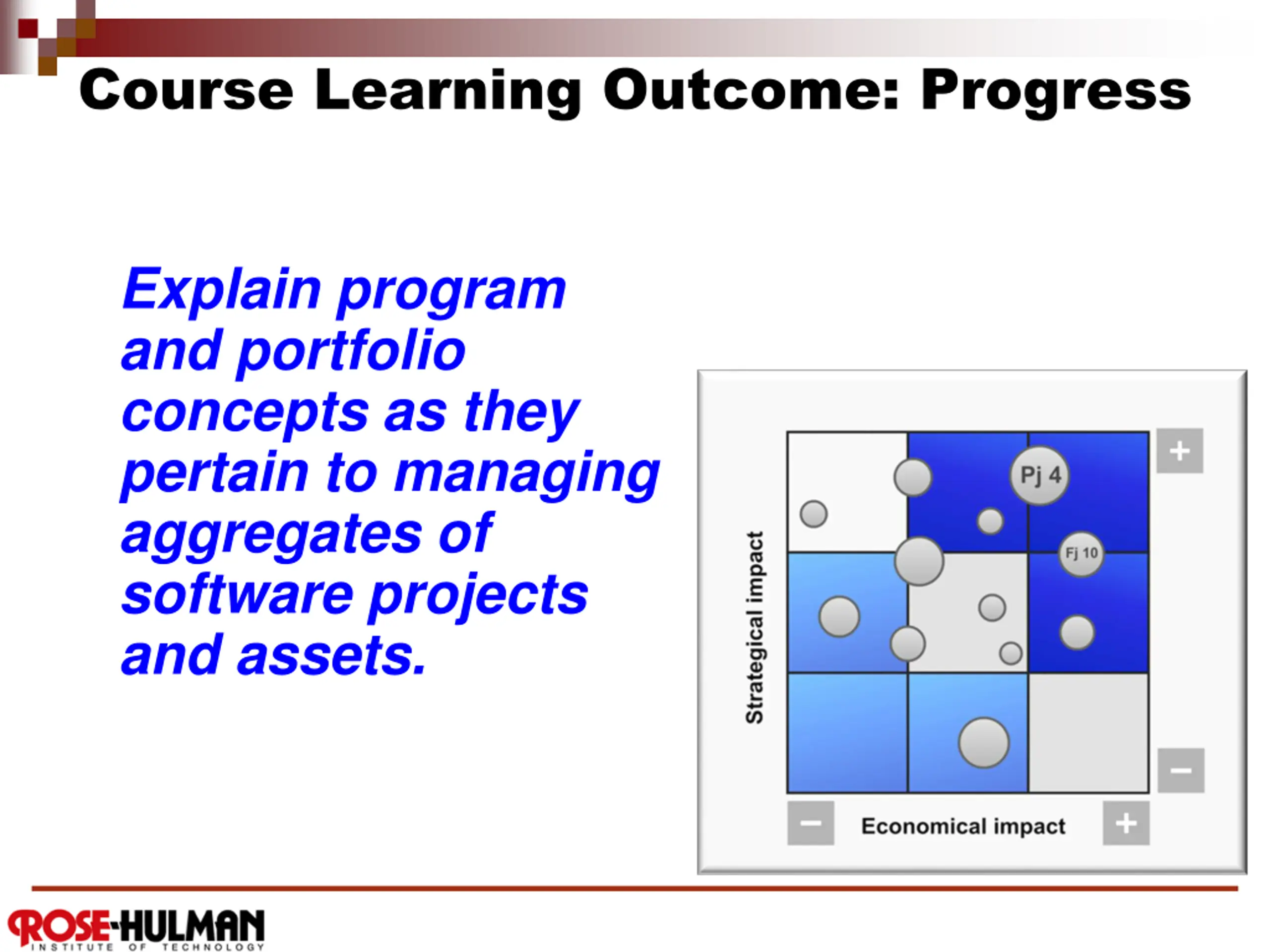 Course Learning Outcome: Progress Explain program and portfolio concepts as they pertain to managing aggregates of software projects and assets.