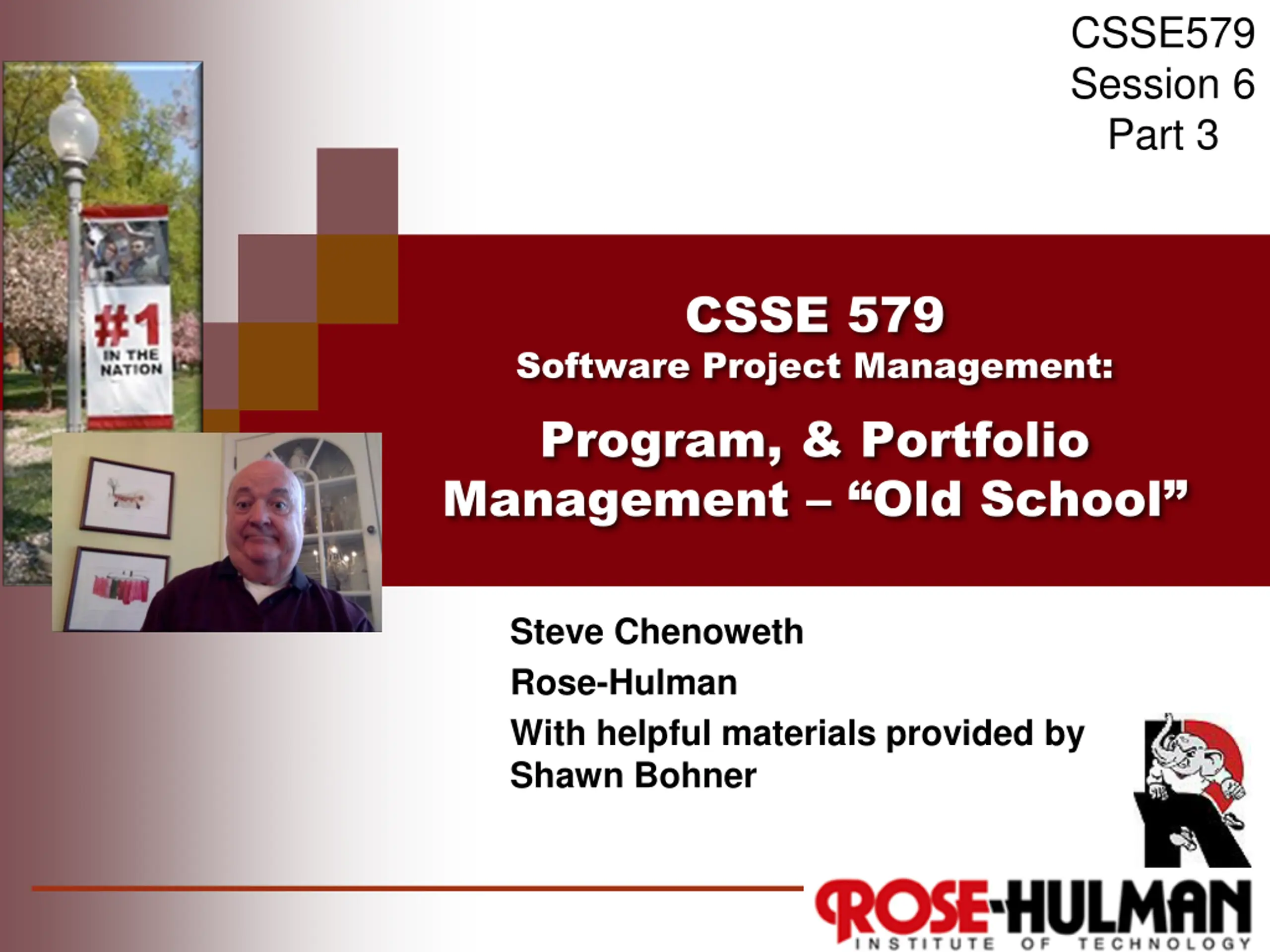 CSSE579 Session 6 Part 3 CSSE 579 Software Project Management: Program, & Portfolio Management Old School Steve Chenoweth Rose-Hulman With helpful materials provided by Shawn Bohner