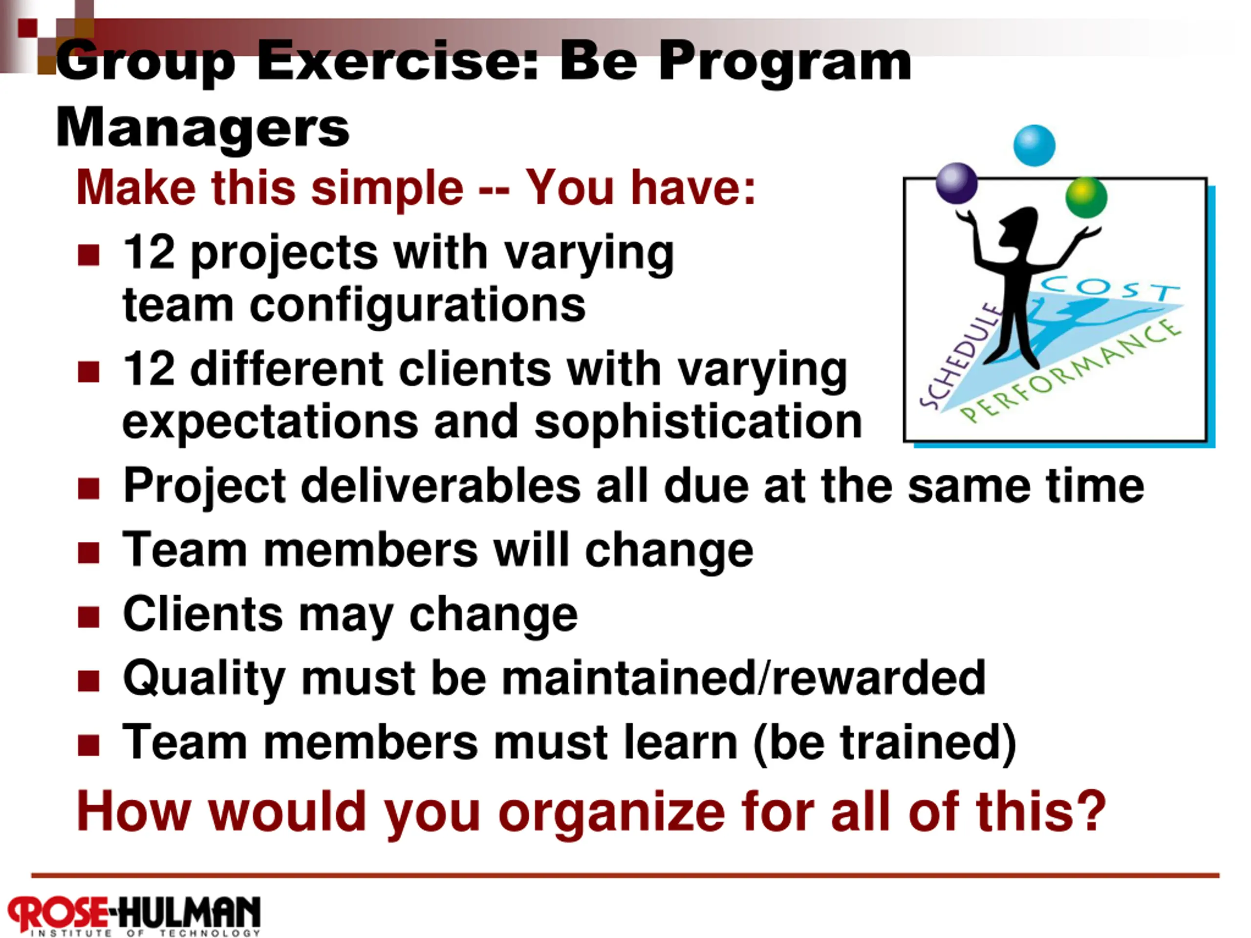 Group Exercise: Be Program Managers Make this simple -- You have: 12 projects with varying team configurations 12 different clients with varying expectations and sophistication Project deliverables all due at the same time Team members will change Clients may change Quality must be maintained/rewarded Team members must learn (be trained) How would you organize for all of this?